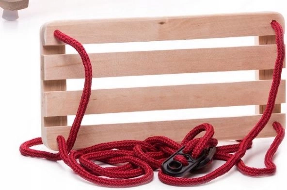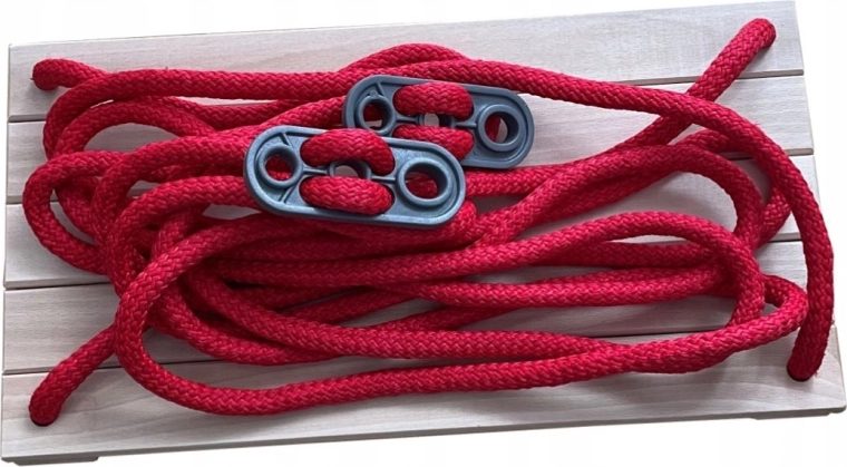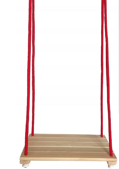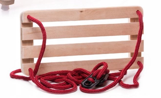 Silné červené laná s možnosťou rýchleho dotiahnutia pomocou plastového uťahovača zaistia spoľahlivé uchytenie a jednoduché nastavenie výšky. Zaoblené hrany a kvalitné kovanie prispievajú k bezpečnosti, zatiaľ čo univerzálny prírodný vzhľad sa hodí na terasu, balkón aj do detskej izby.