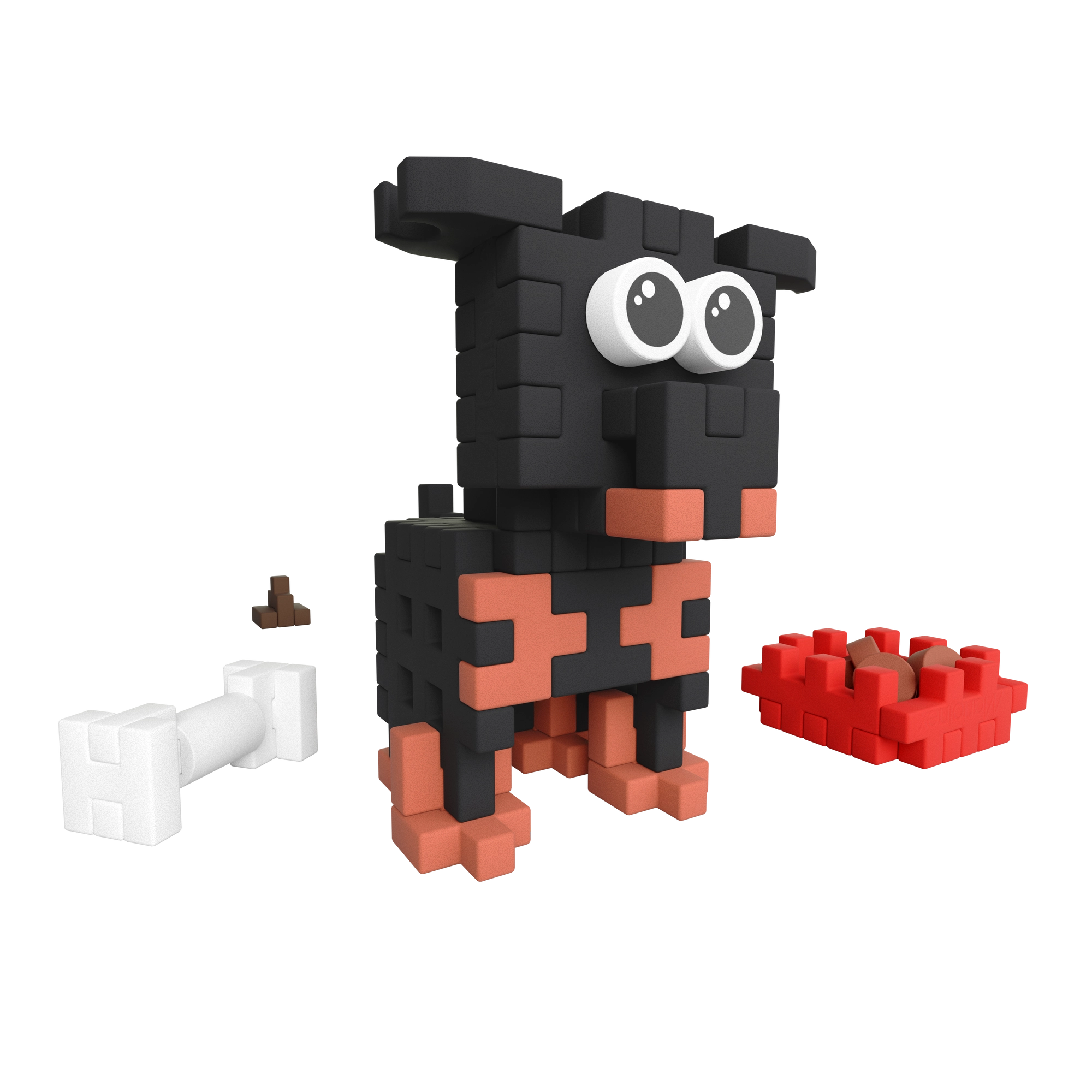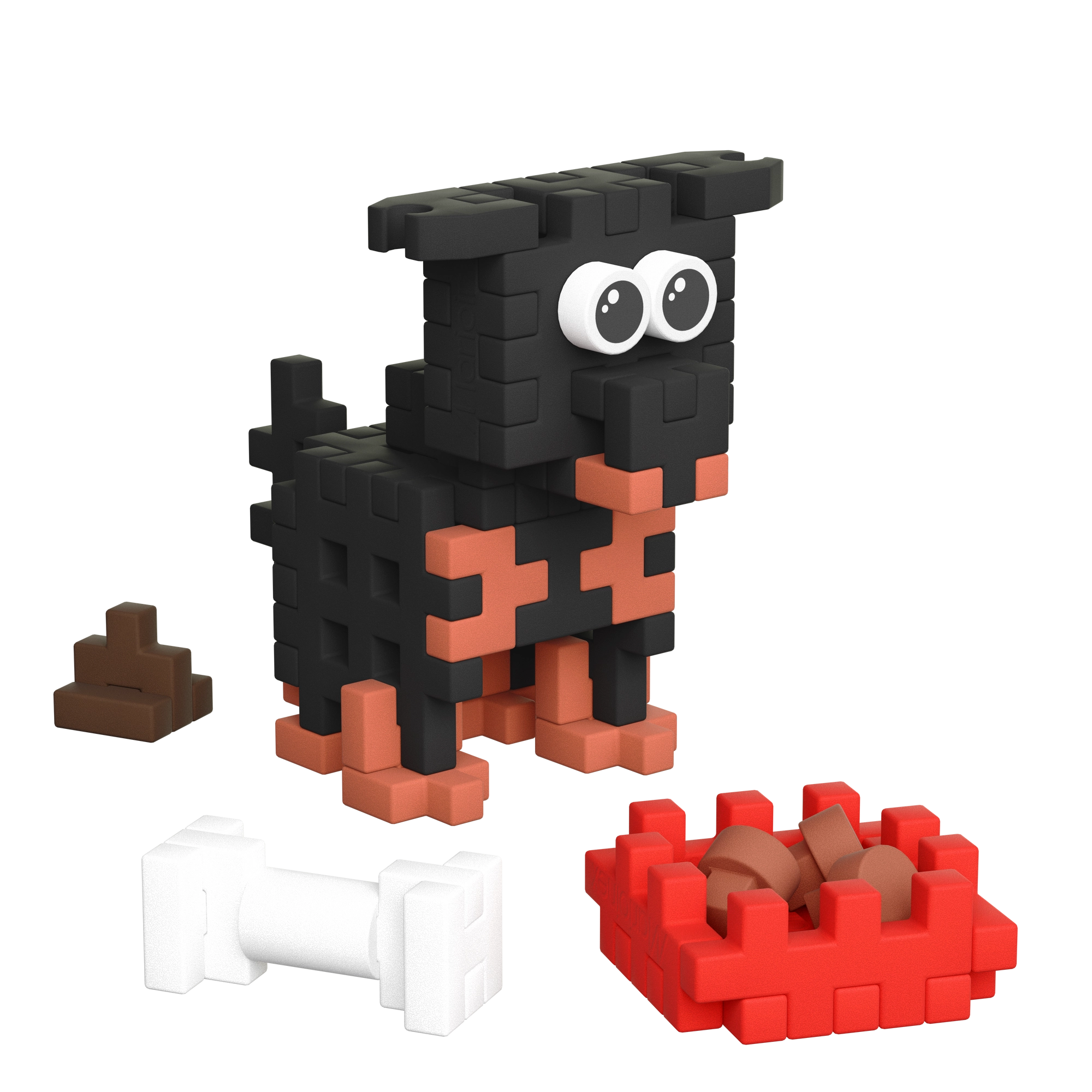 Postavte si štýlového psíka s veľkými očami a doplnkami – misku s granulami, kosť aj „bobok“. Skvelý základ pre príbehovú hru detí.