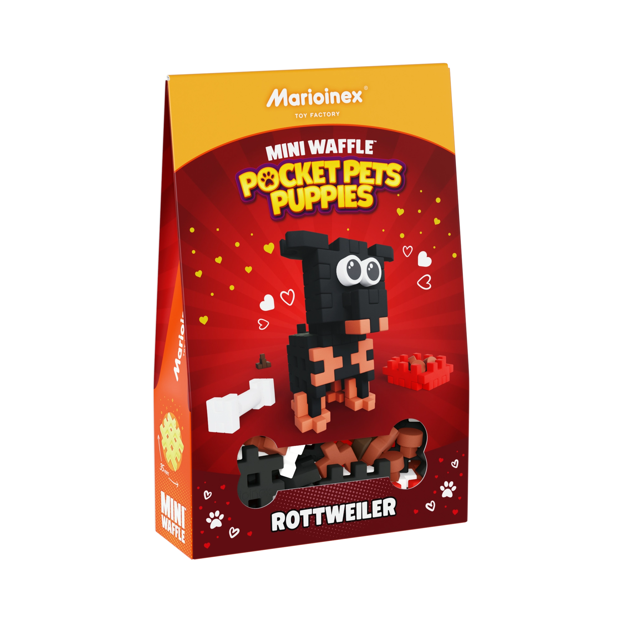 Objavte zábavnú stavebnicu MARIOINEX Mini Waffle Pocket Pets s motívom rozkošného rottweilera. V kompaktnom balení nájdete 50 farebných dielikov na stavbu psej figúrky a doplnkov – misky s granulami, kosti a bobka. Dieliky sa ľahko spájajú, sú flexibilné, odolné a bezpečné, takže deti môžu tvoriť v 2D aj 3D a rozvíjať kreativitu, jemnú motoriku aj logické myslenie.