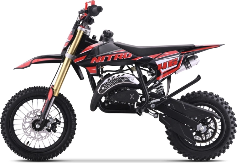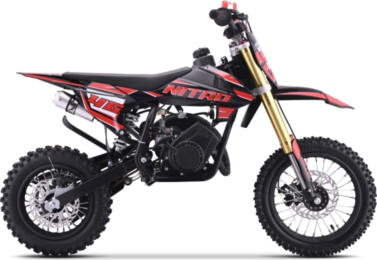 Detská benzínová motorka NITRO 60cc je skvelou voľbou pre mladých jazdcov, ktorí chcú preniknúť do sveta off-roadu. Ľahká a pevná konštrukcia s práškovo lakovaným rámom a vystuženou kyvnou vidlicou vydrží aj náročnejšie zaobchádzanie. Vzduchom chladený dvojtaktný jednovalec 60 cm³ poskytuje svižný záťah, zatiaľ čo reťazový prevod spoľahlivo prenáša výkon na zadné koleso.