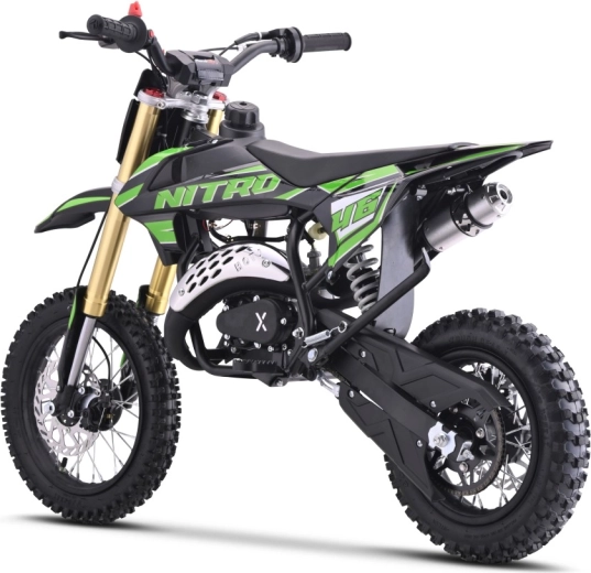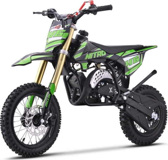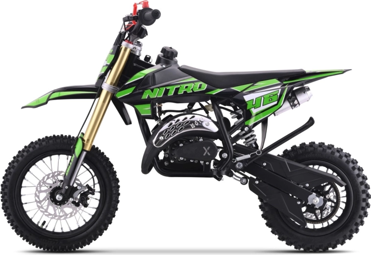 Objavte zábavu v teréne s minibikom NITRO 60 cc v zelenom prevedení. Ľahká a pritom odolná oceľová rámová konštrukcia, výkonný dvojtaktný motor, hydraulické teleskopické odpruženie a kotúčové brzdy vpredu aj vzadu zaisťujú istotu a kontrolu. Vďaka nafukovacím terénnym pneumatikám s hlbokým dezénom zvládne nerovnosti a ponúkne rýchlosť až 50 km/h.