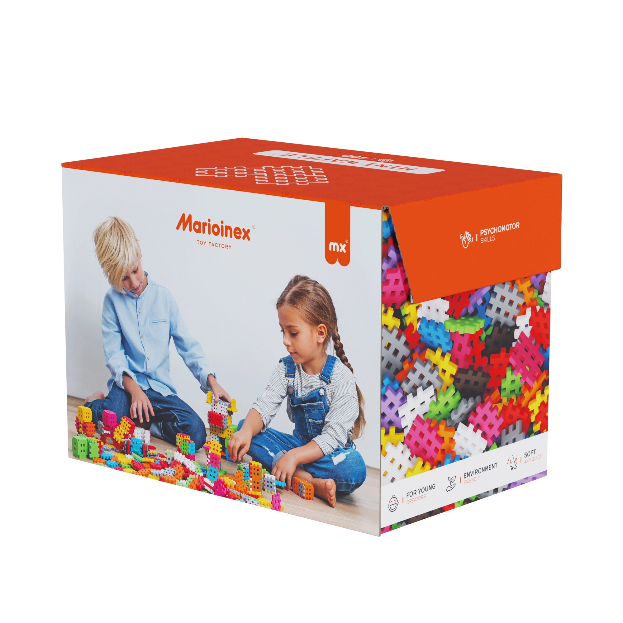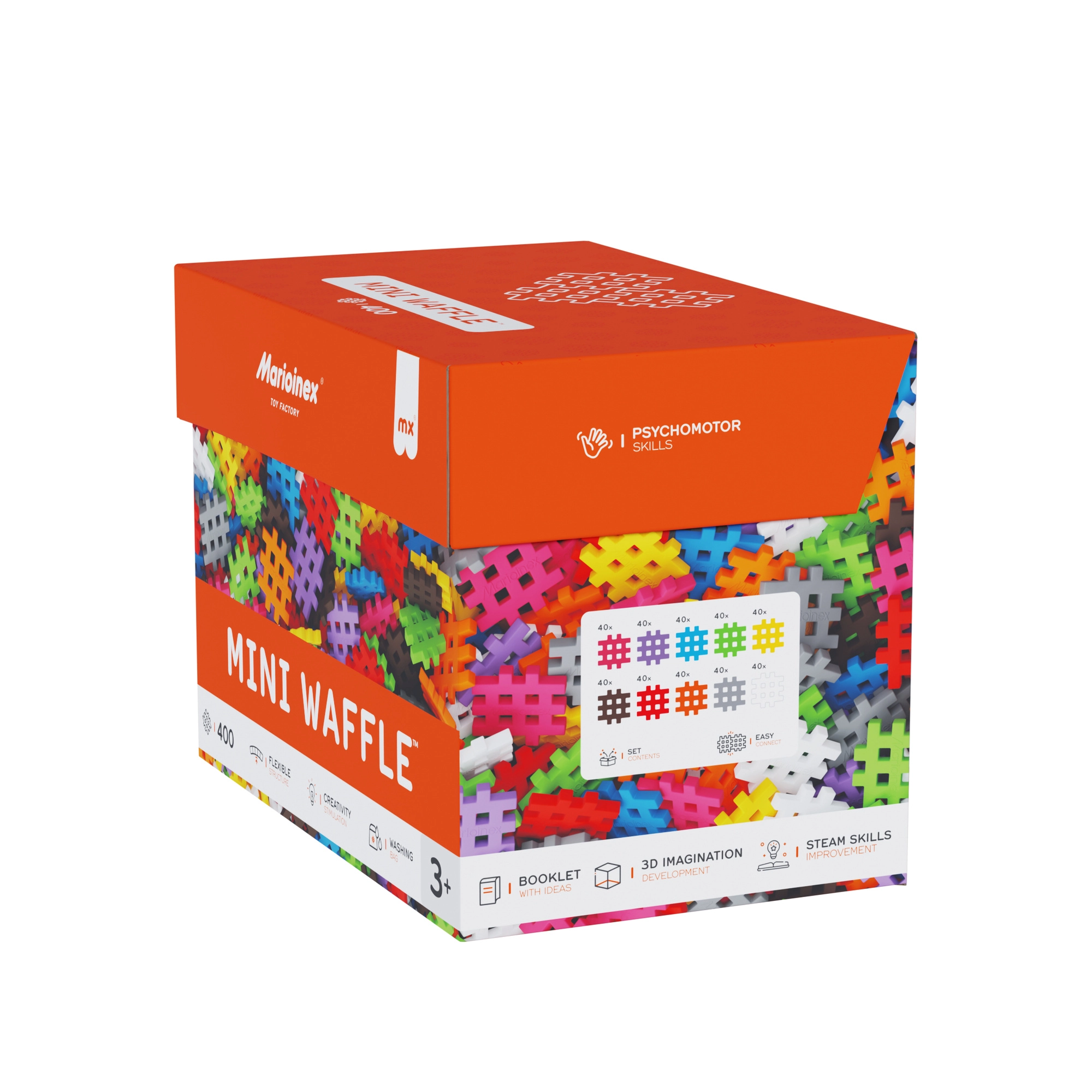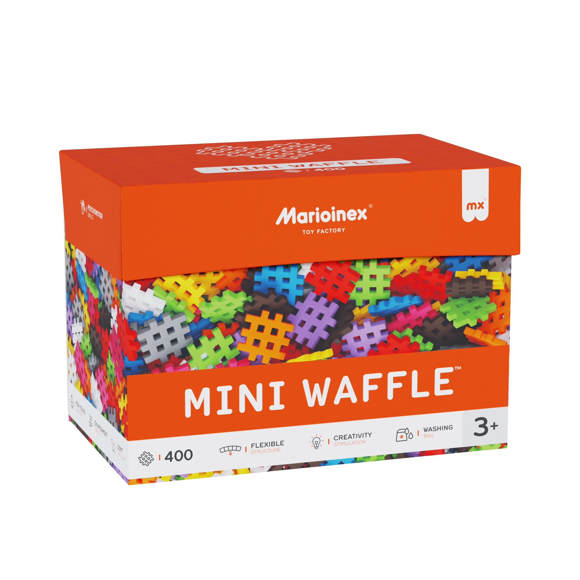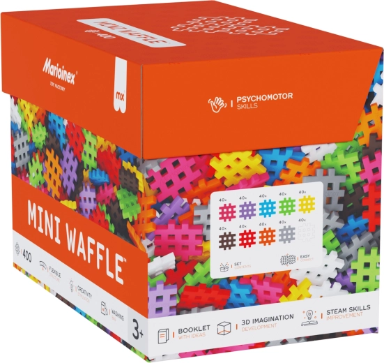 Stavebnica Marioinex Mini Waffle prináša deťom hravú cestu k učeniu. Vďaka mäkkému materiálu a šikovnému tvaru sa dieliky ľahko spájajú aj odpájajú a malé ruky ich pohodlne uchopia. 400 dielikov v pestrých farbách povzbudzuje k voľnej tvorbe aj k nasledovaniu návodov – od jednoduchých modelov po nápadité 3D stavby.