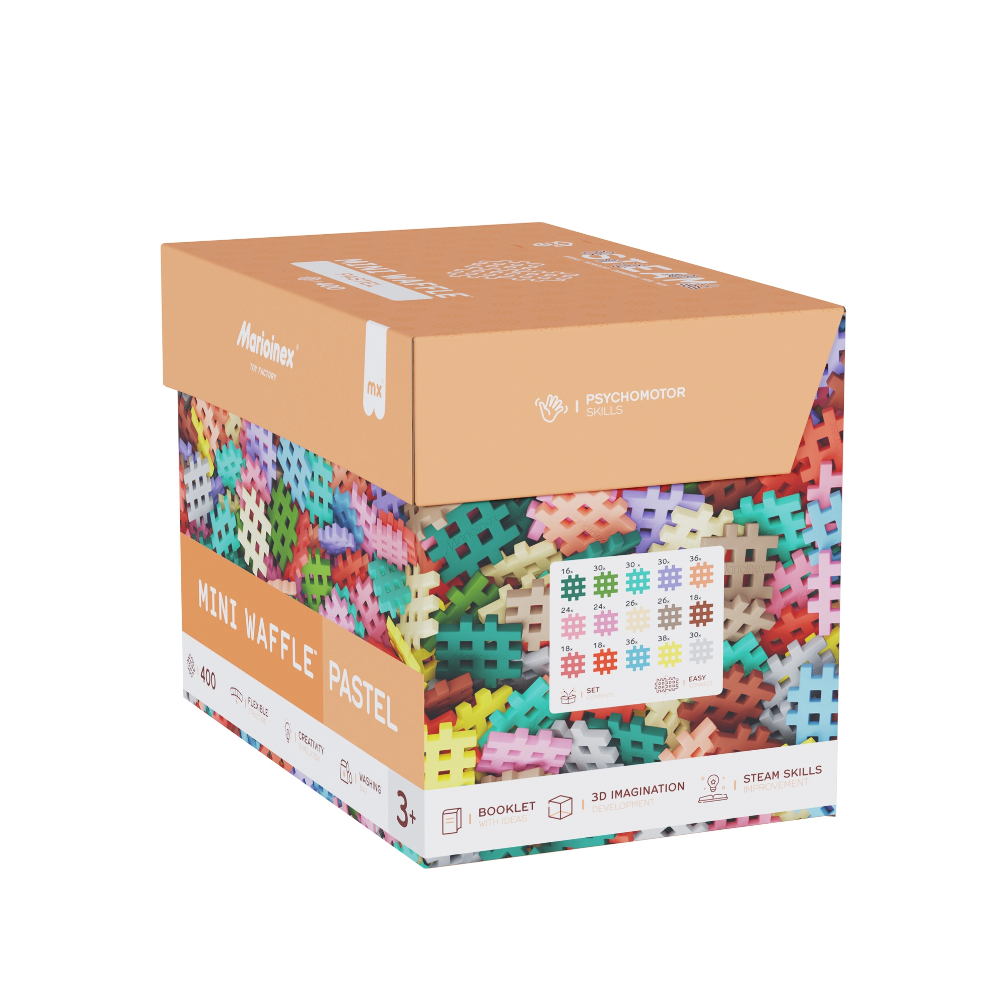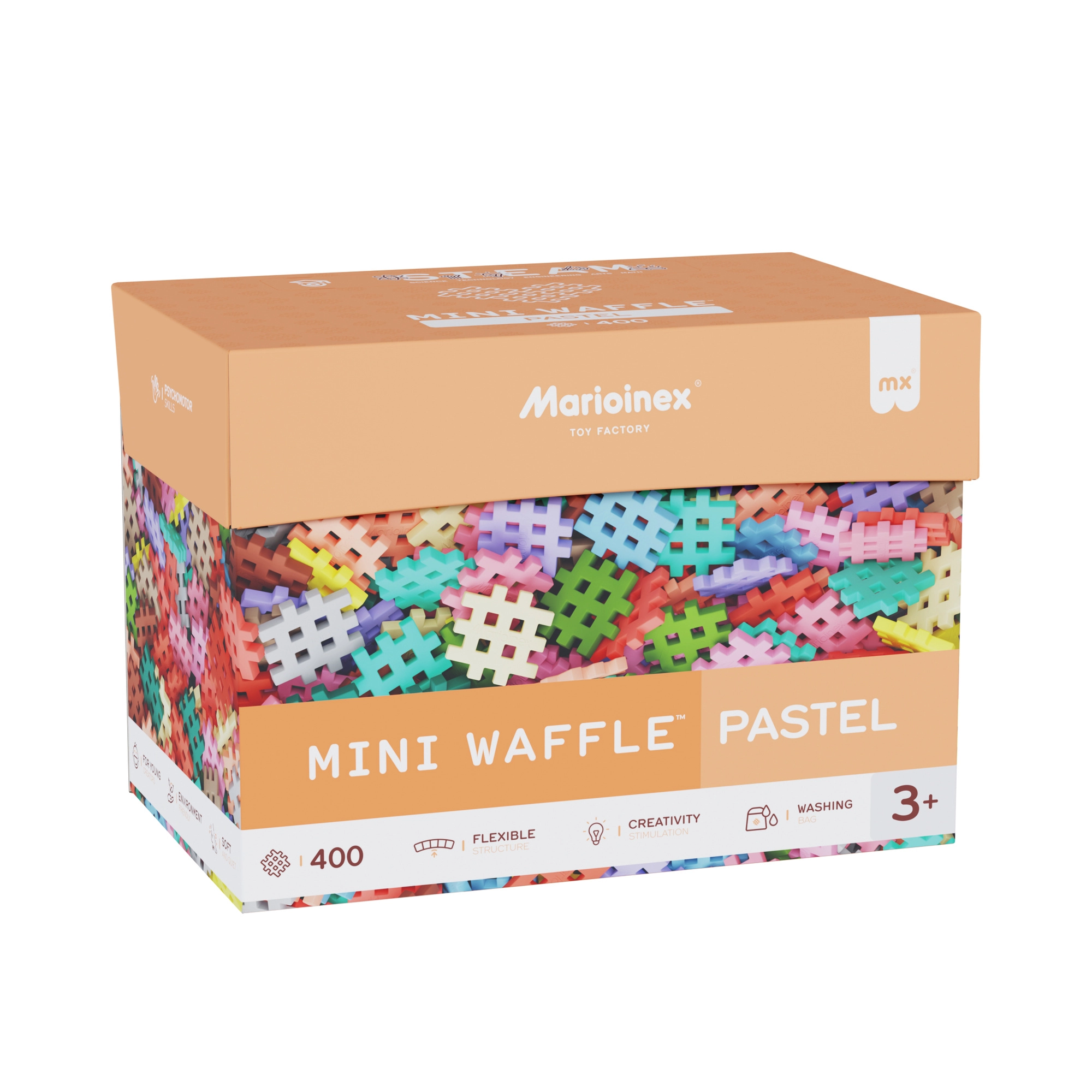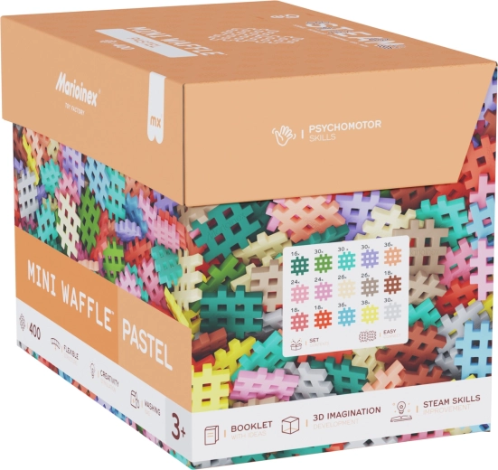 Stavebnica Mini Waffle Pastel prináša deťom od 3 rokov hodiny zmysluplnej zábavy. Vďaka mäkkým a ohybným dielikom sa deťom pohodlne pracuje, a to aj najmenším staviteľom. Súčasťou je inšpiratívny návod pre prvé projekty, no skutočnou hranicou je len fantázia – od postavičiek cez zvieratká až po originálne stavby.