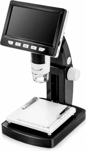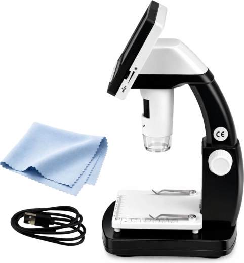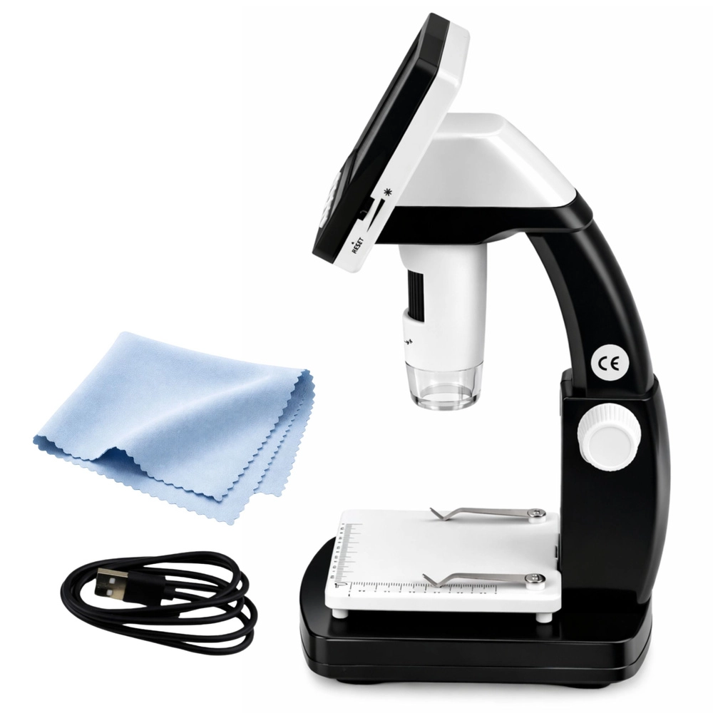 Kompaktný digitálny mikroskop so 4,3" IPS displejom na pohodlné sledovanie bez počítača. Ponúka zväčšenie až 1000×, 8 LED diód s nastaviteľným jasom a manuálne zaostrovanie 0–40 mm. Ľahko vytvoríte fotografie (JPG) aj videá (AVI), napájanie zabezpečuje integrovaná batéria 1200 mAh a konektivitu USB‑C.