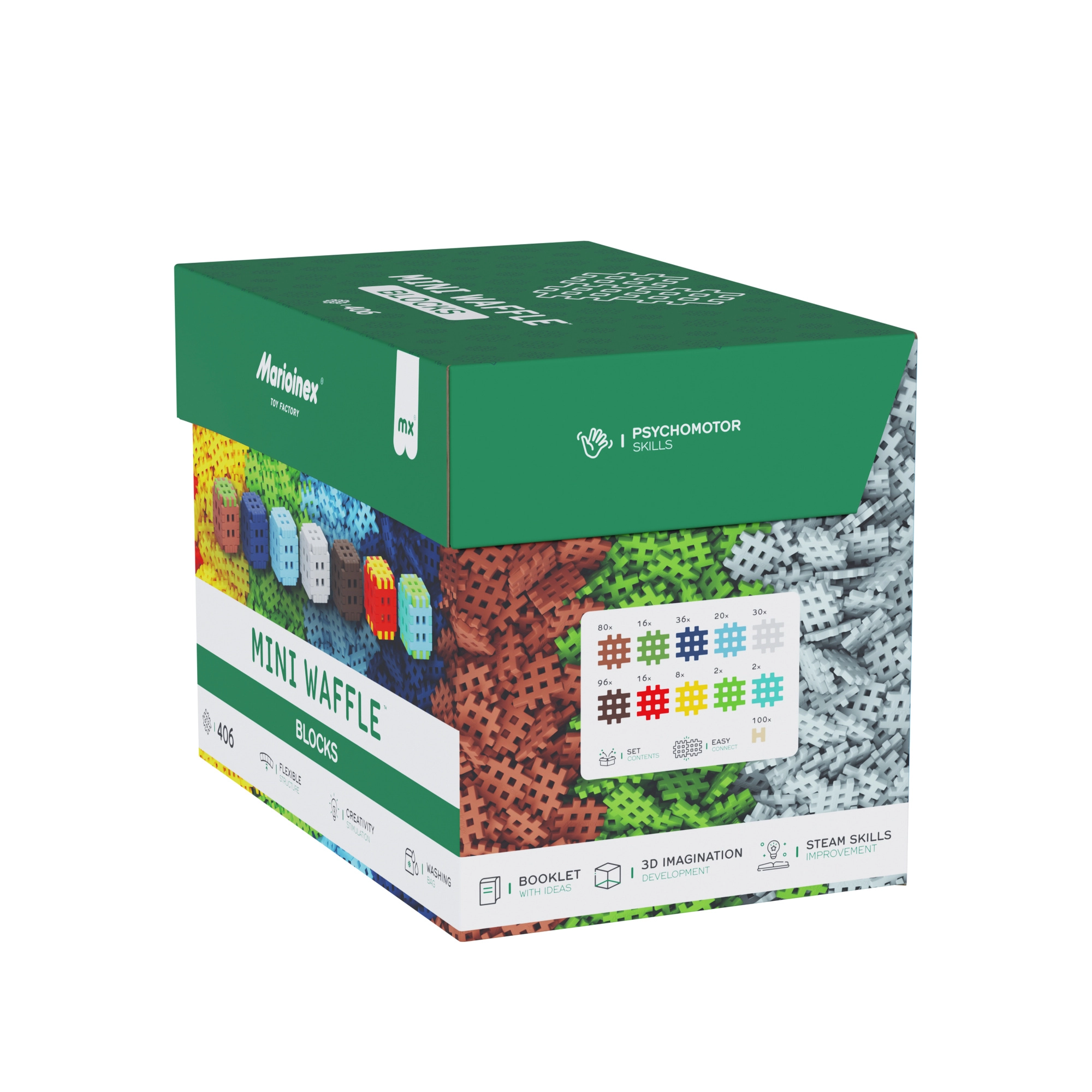 Špeciálny tvar Mini Waffle uľahčuje manipuláciu a zabezpečuje pevné spojenie dielikov, takže modely držia tvar a možno ich opakovane prestavovať.