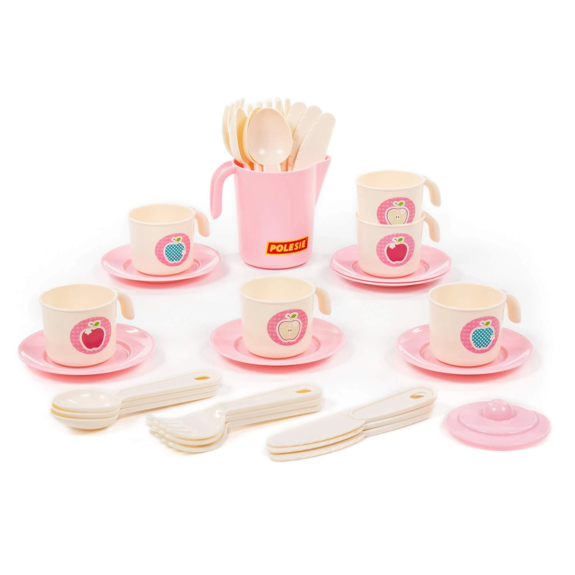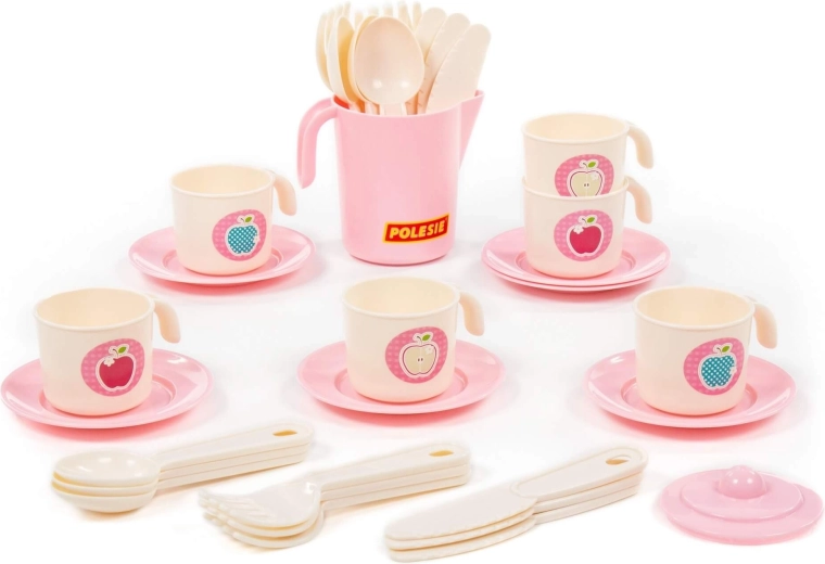Sada s 32 dielmi zahŕňa šálky s podšálkami, tanieriky, príbory a čajník – deti majú všetko, čo potrebujú na servírovanie nápojov a dobrôt.