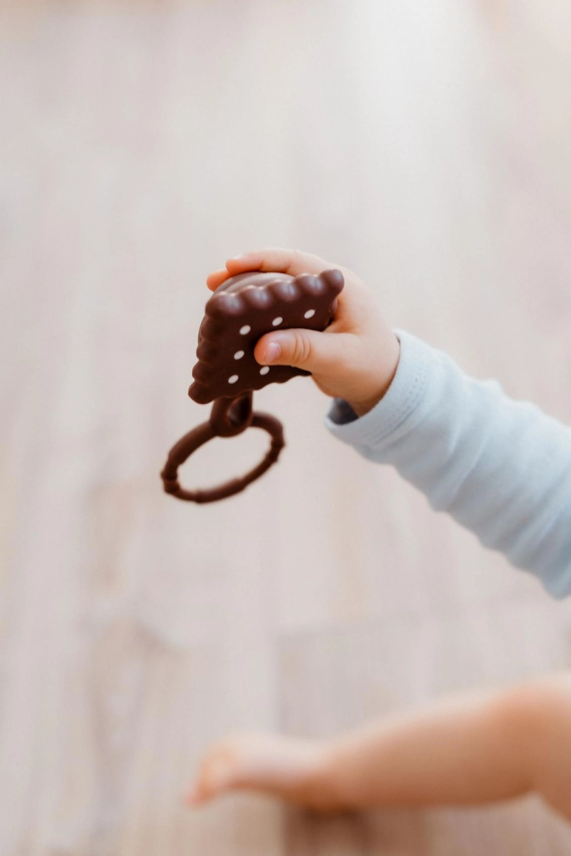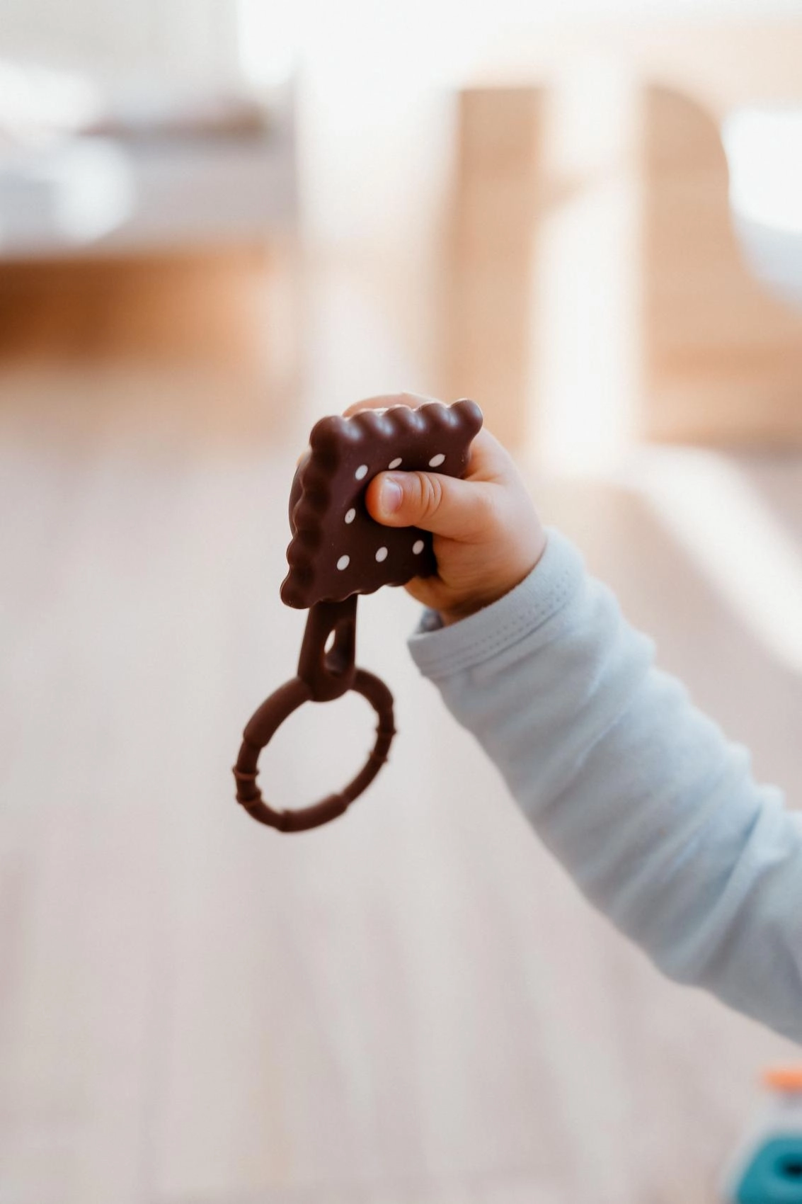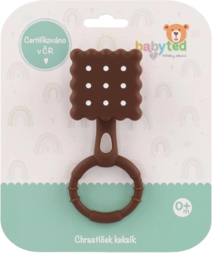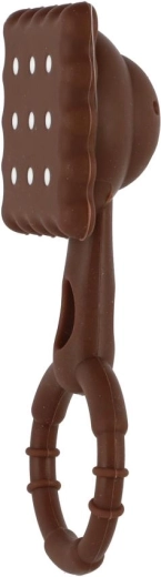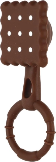 Originálny „sušienkový“ dizajn podnecuje zvedavosť, mäkký a flexibilný silikón je príjemný na dotyk a šetrný k citlivým ďasnám. Jemné hrkanie podporuje vnímanie zvuku bez rušivého hluku. Povrch s textúrou napomáha masáži ďasien a prispieva k prirodzenému upokojeniu bábätka.