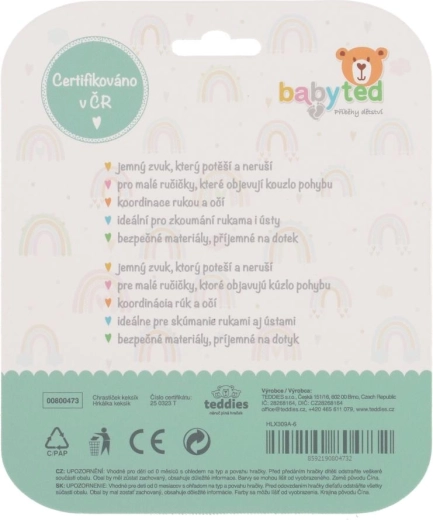 Tichý hrkavý zvuk rozvíja sluchové vnímanie dieťaťa bez nadmerného hluku, ideálne pre pokojné hranie.