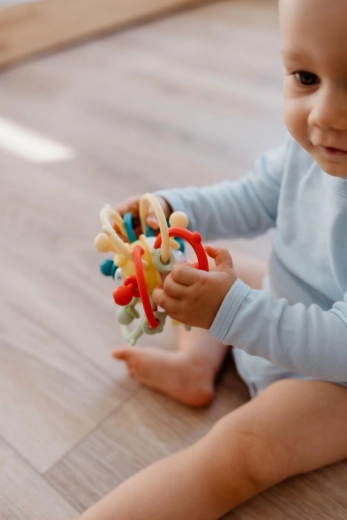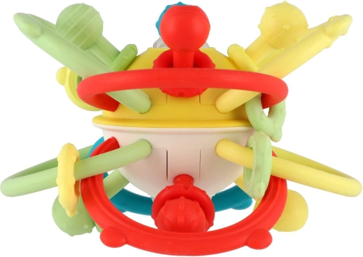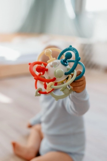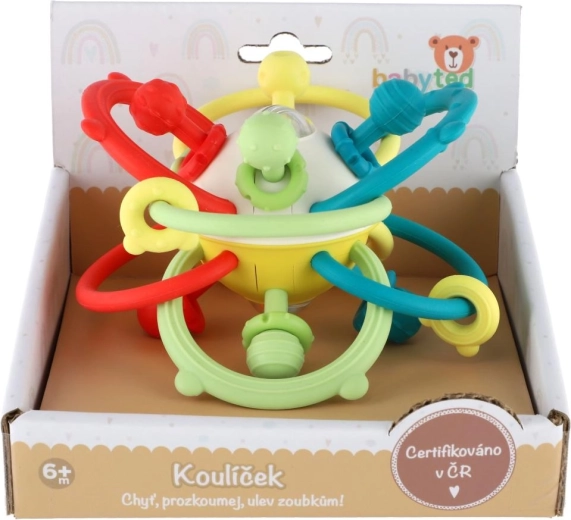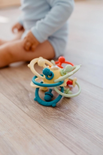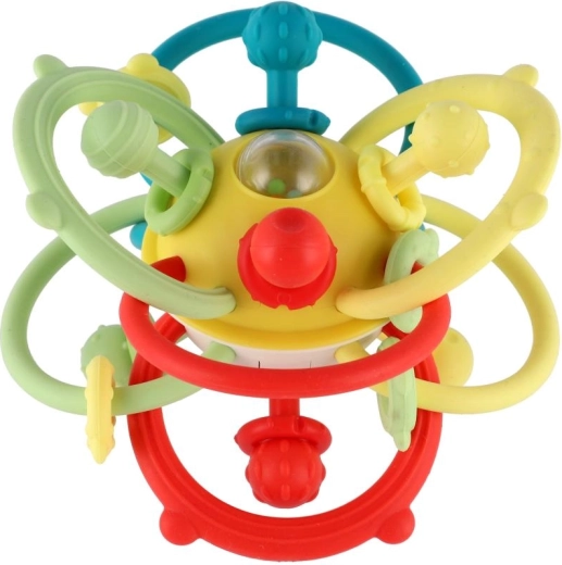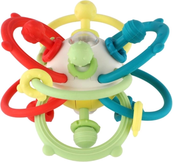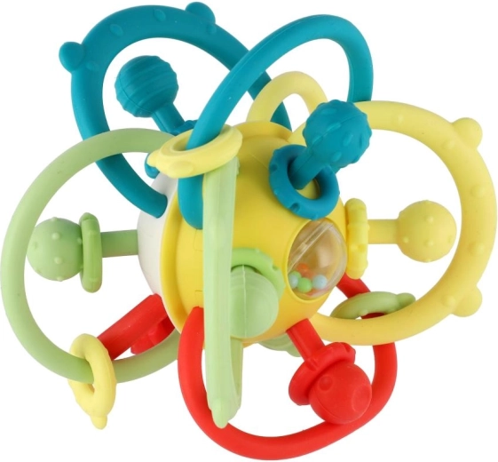 Priehľadná centrálna časť s farebnými guľôčkami vytvára jemný zvuk, ktorý podporuje sluchové vnímanie a motivuje k aktívnemu pohybu – traseniu, prehadzovaniu z ruky do ruky aj váľaniu po podložke. Hračka je navrhnutá na rozvoj jemnej motoriky, koordinácie oko–ruka a zmyslovú stimuláciu od 6 mesiacov.