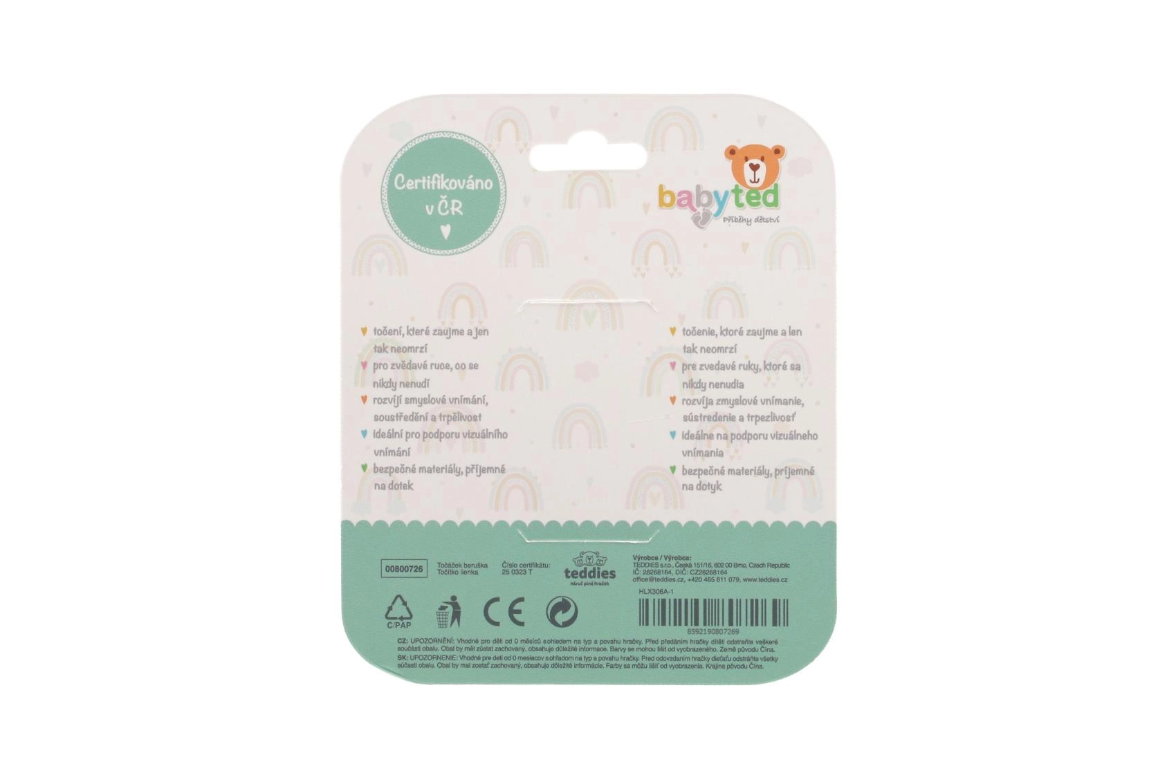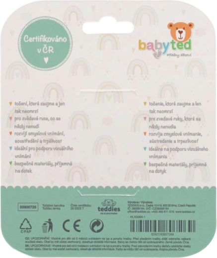 Otočný stred a hmatové prvky (bublinky, výstupky) nabádajú k stláčaniu, otáčaniu a skúmaniu, čím prirodzene rozvíjajú koordinačné zručnosti, úchop a jemnú motoriku. Kontrastná červená s čiernymi bodkami a zeleným detailom podporujú zrakové vnímanie a udržiavajú detskú pozornosť.