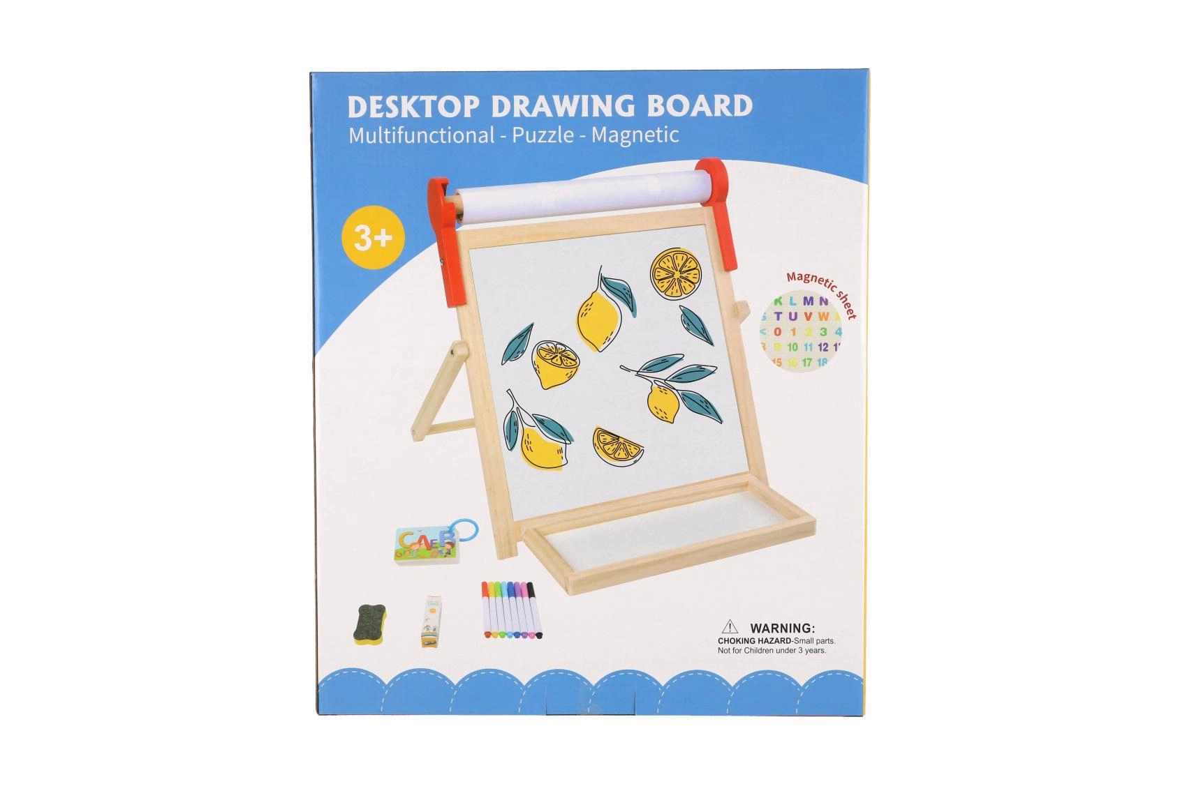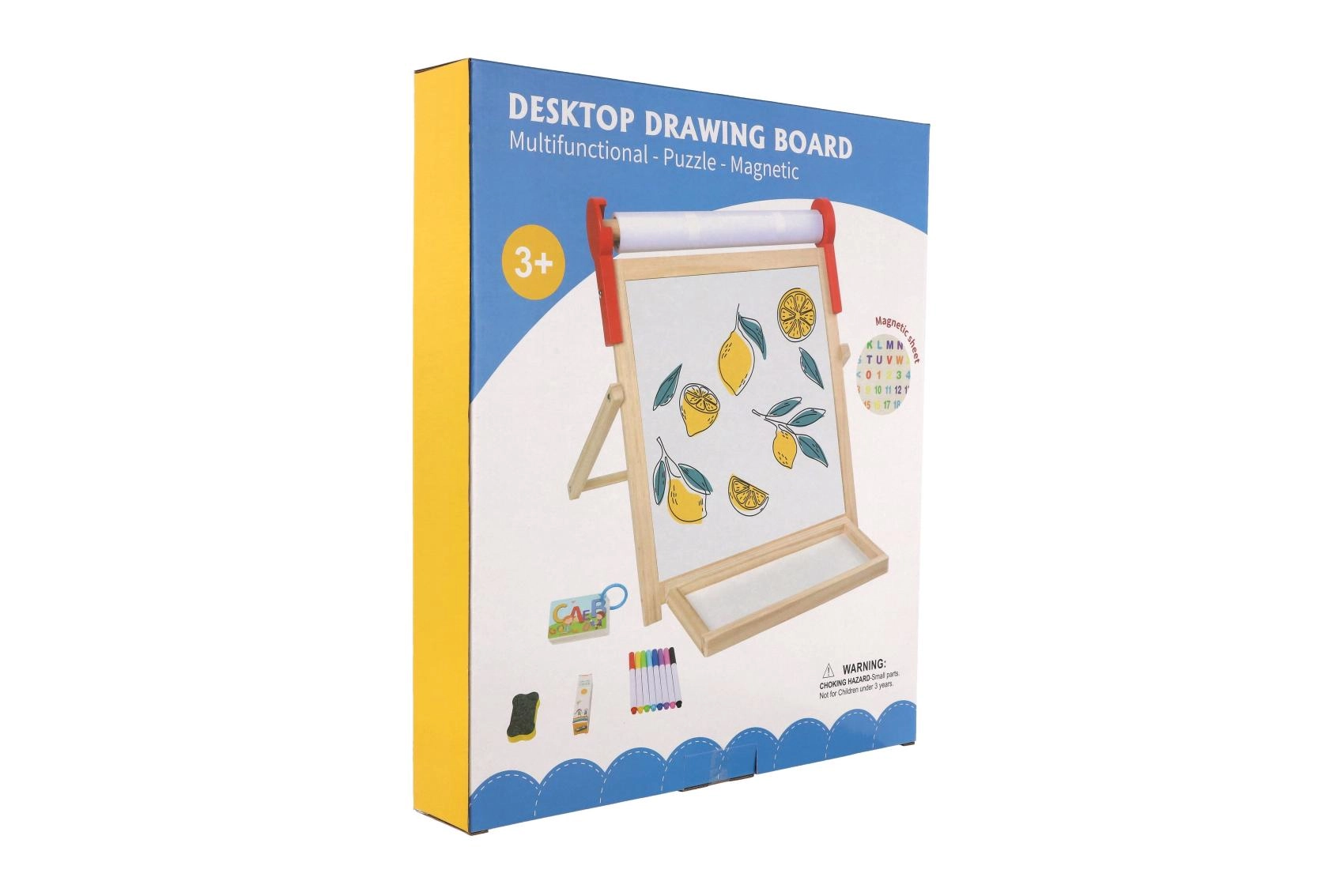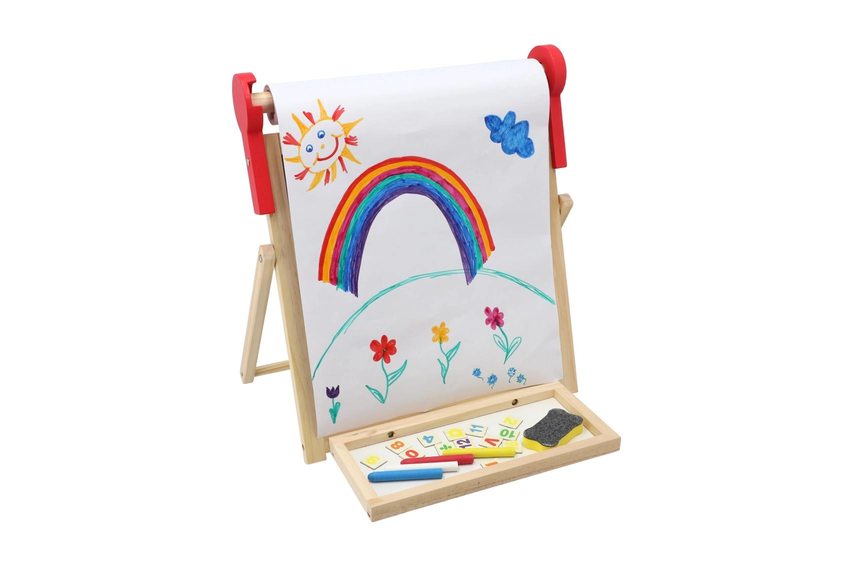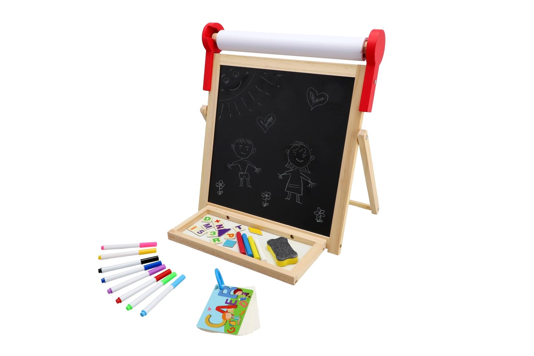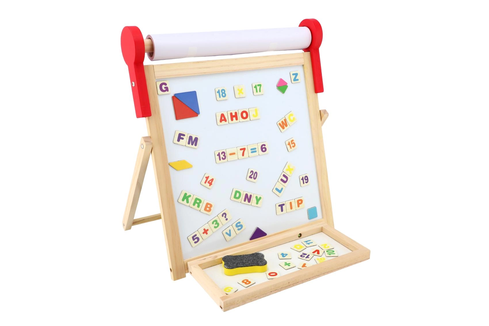 Táto kvalitná tabuľa s drevenou konštrukciou kombinuje učenie a hru v jednom kompaktnom prevedení na domáce tvorenie. Deti môžu písať fixkami na magnetickú bielu stranu, prichytávať magnetické písmená a číslice alebo kresliť kriedou na klasickú čiernu stranu. Integrovaná rolka papiera rozširuje možnosti tvorenia o maľovanie vo veľkom formáte.
