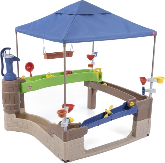 Vodné centrum Pump & Splash Shady Oasis prináša deťom kreatívnu zmyslovú hru na čerstvom vzduchu. Ručná pumpa rozhýbe vodu do troch žliabkov, kde prúd spúšťa kolotoče, lieviky a výklopné vedierka, a vracia sa späť do nádrže – cirkulácia bez plytvania. Baldachýn v štýle stánku zabezpečuje tieň a príjemné prostredie aj v horúcich dňoch.