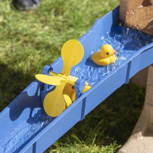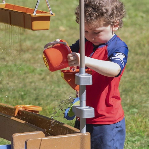 Voda spúšťa kolesá, lieviky a efektný dažďový tanier, čo podporuje zmyslovú hru a STEM učenie.