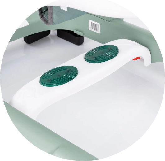 Rodičia ocenia premyslené bezpečnostné prvky: protišmykové podložky a zarážky, možnosť uzamknutia koliesok a plynulú reguláciu rýchlosti pomocou ovládačov pri kolesách. Interaktívny panel s farebnými hudobnými tlačidlami, svetlami a pohyblivými hračkami podporuje rozvoj zmyslov, fantázie a jemnej motoriky.
