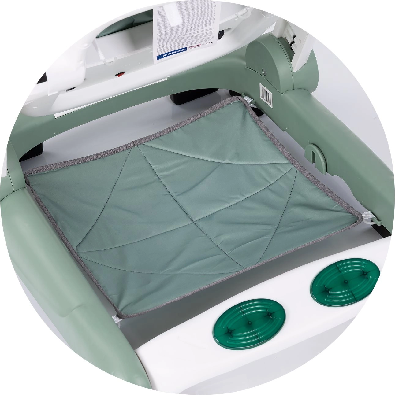 Protišmykové podložky, zarážky, uzamykateľné kolieska a regulácia rýchlosti dopĺňa mäkké sedadlo a stabilná široká základňa.
