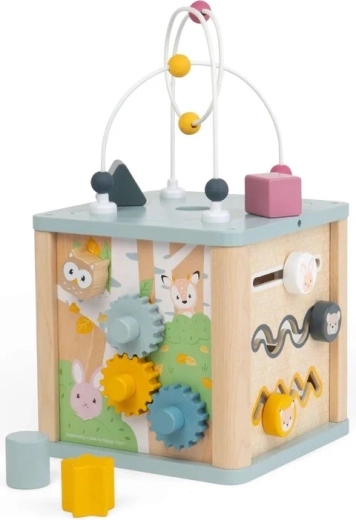 Objavte všestrannú drevenú aktívnu kocku pre batoľatá, ktorá ponúka hodiny chytrej zábavy. Každá strana prináša inú činnosť – vkladacie tvary, ozubené kolieska, guličkovú dráhu a korálkový labyrint navrchu. Vyrobené zo 100 % FSC certifikovaného dreva v jemných pastelových farbách pre bezpečné hranie a rozvoj jemnej motoriky, oko-ruka koordinácie aj riešenia problémov.