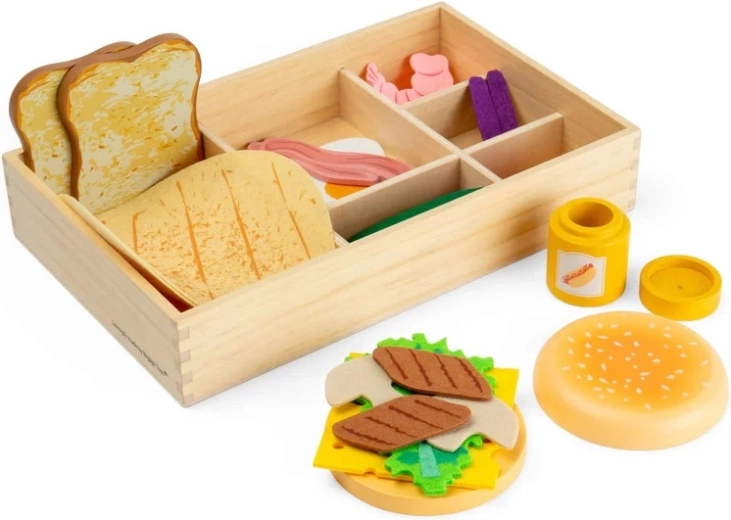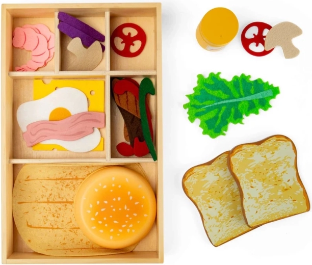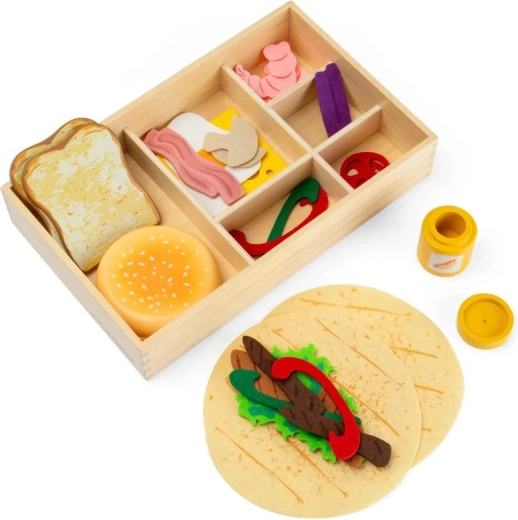 Široká paleta drevených a plstených ingrediencií umožňuje deťom skladať sendviče, burgre aj wrapy presne podľa chuti a rozvíjať fantáziu i jemnú motoriku.