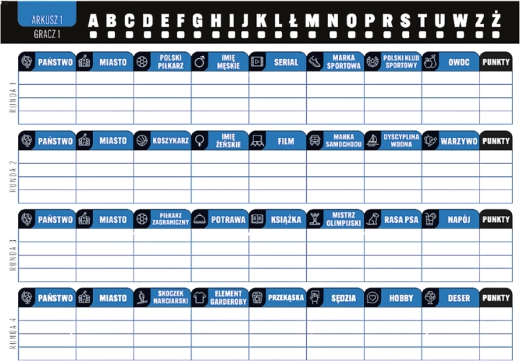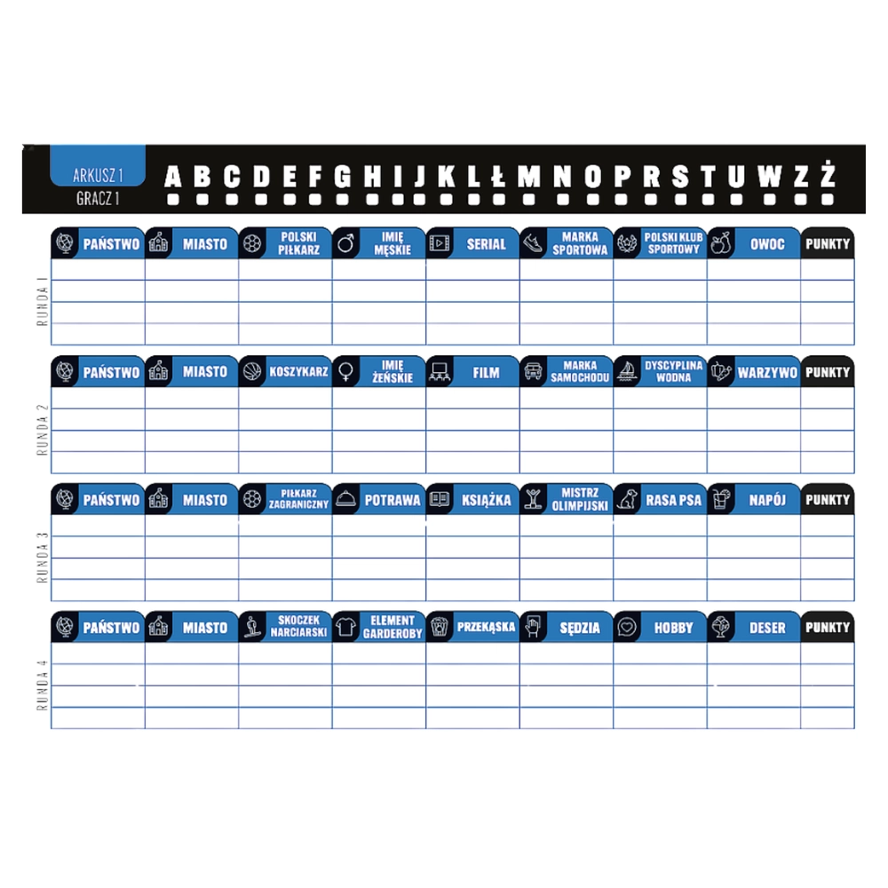 V každom kole sa určí písmeno abecedy a hráči zapisujú odpovede do daných športových kategórií. Body získate za správne a jedinečné výrazy – čím originálnejšia odpoveď, tým väčšia šanca na výhru. Hra podporuje kreativitu, postreh a prirodzene rozvíja slovnú zásobu so športovou tematikou.