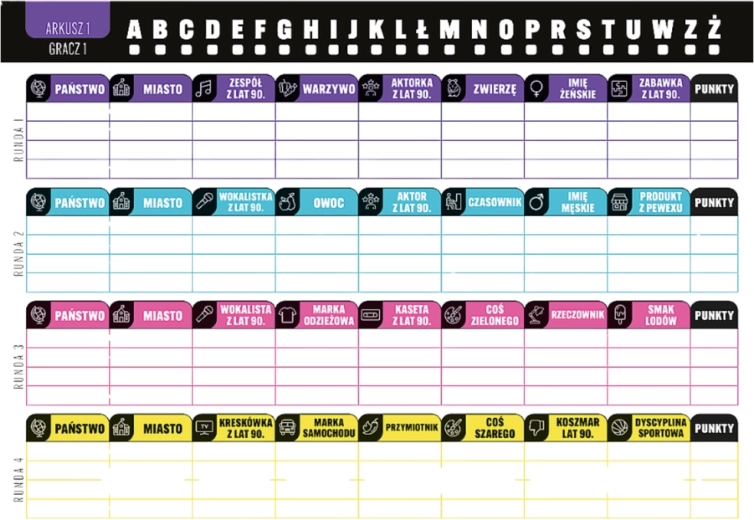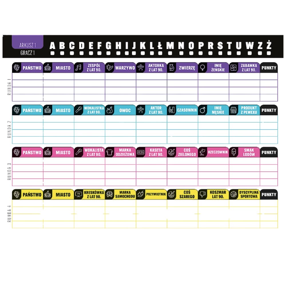 V tejto obľúbenej spoločenskej hre hráči losujú písmeno a v časovom limite zapisujú slová do kategórií ako štát, mesto, zviera, predmet alebo meno. Body získate za správne a jedinečné odpovede – kto ich má najviac, vyhráva. Hra je rýchla, chytľavá a prináša množstvo smiechu aj nostalgie.