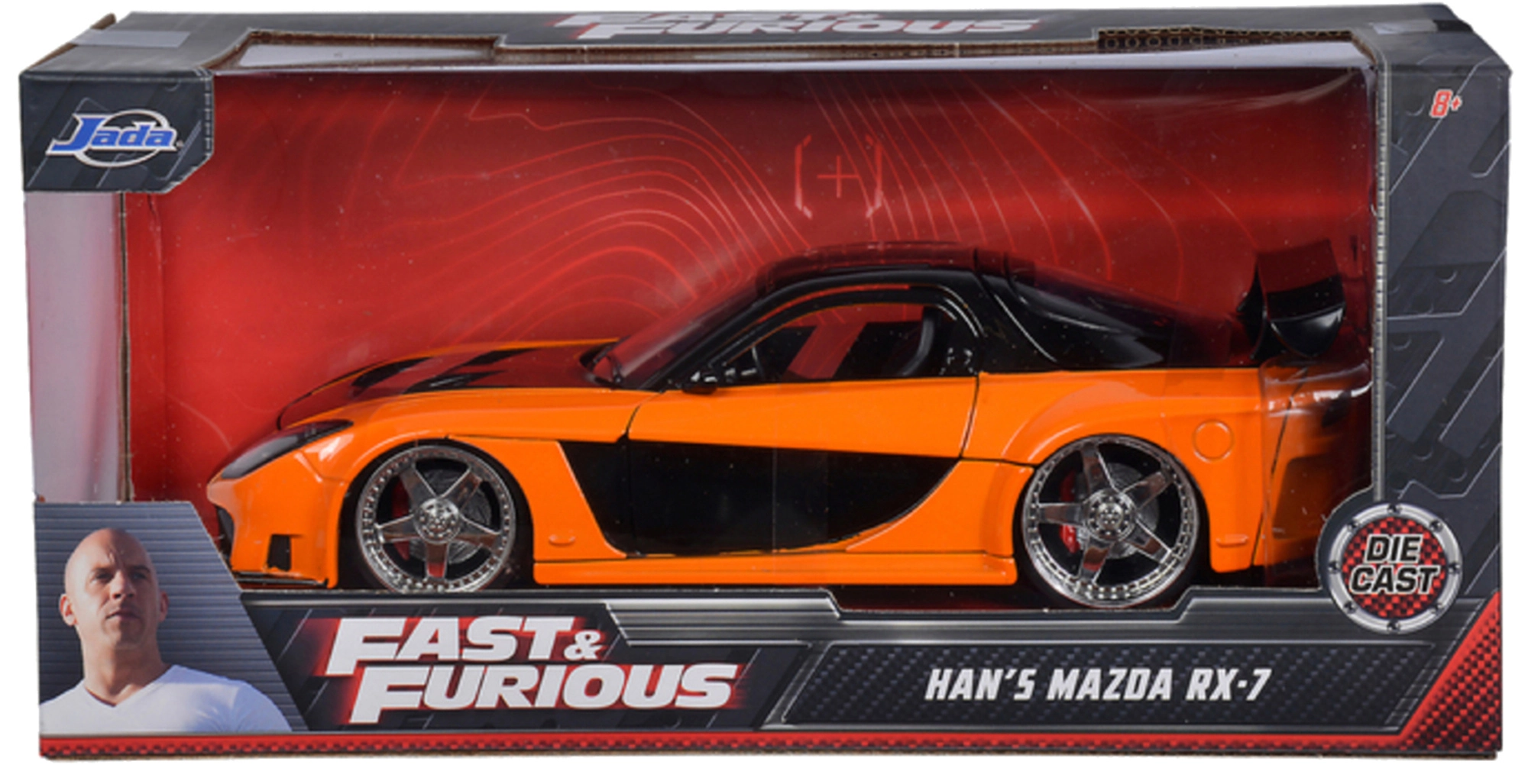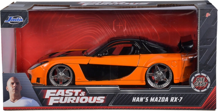 Autentický model vozidla MAZDA RX-7 z filmovej série FAST & FURIOUS od značky Jada Toys poteší zberateľov aj deti. Ponúka kovovú karosériu, otváracie dvere a kapotu a precízne spracovanie detailov. Dĺžka modelu je 19 cm, ideálna ako dekorácia aj na hranie.