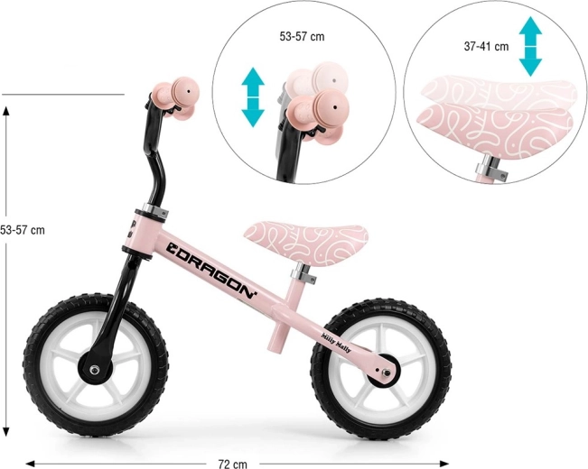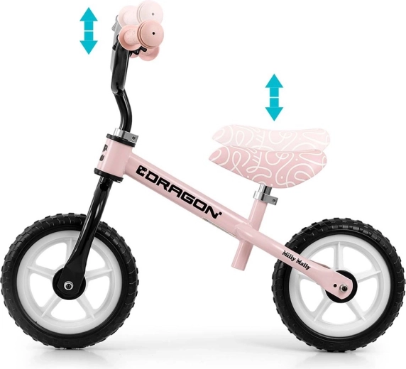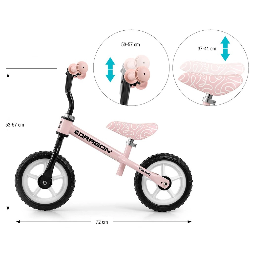 Naštartujte učenie rovnováhy s odrážadlom MILLY MALLY Dragon v ružovej farbe. Vďaka jazde bez pedálov sa deti ľahko sústredia na udržanie rovnováhy a koordináciu. Ľahký, no odolný oceľový rám, penové kolesá 10" pre hladkú jazdu, nastaviteľné sedlo a riadidlá a obmedzenie otáčania riadidiel pre väčšiu bezpečnosť – všetko, čo malý jazdec potrebuje. Súčasťou je aj zvonček, ktorý deti milujú.