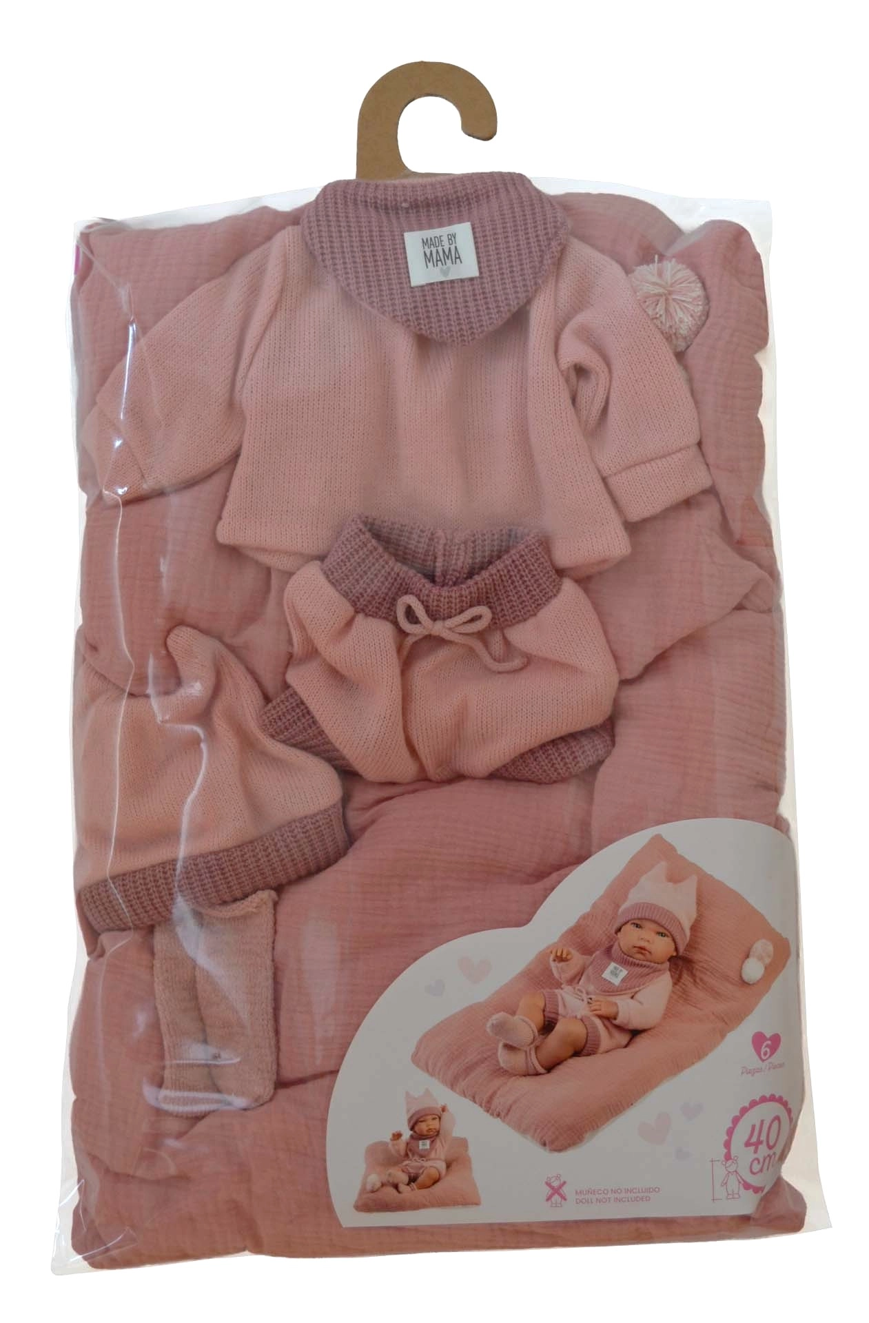 Štyri ladiace kúsky oblečenia dopĺňa ozdobný vankúš/podložka, ktorá zútulní postieľku aj miesto na hranie s bábikou.