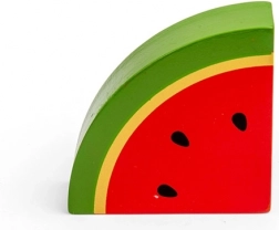 Tento drevený plátok melóna zaujme výraznými farbami a realistickým spracovaním. Je ideálny do detskej kuchynky, obchodu alebo ako doplnok k hre na varenie. Podporuje jemnú motoriku, predstavivosť a rozvoj jazykových zručností pri pomenúvaní potravín.