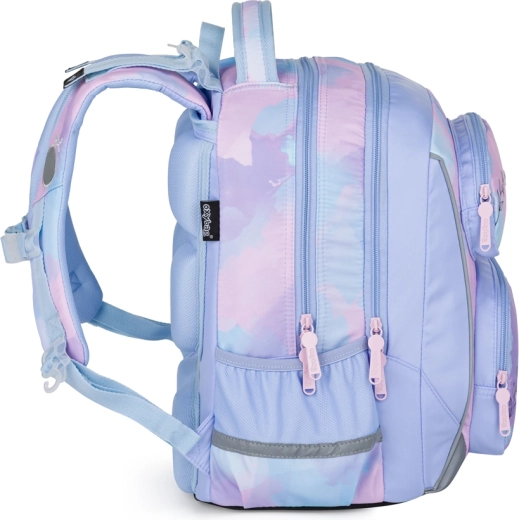 Dve priestranné komory, predné vrecko na desiatu a bočné sieťované vrecká poskytujú prehľadné uloženie učebníc, zošitov, fľaše aj drobností.