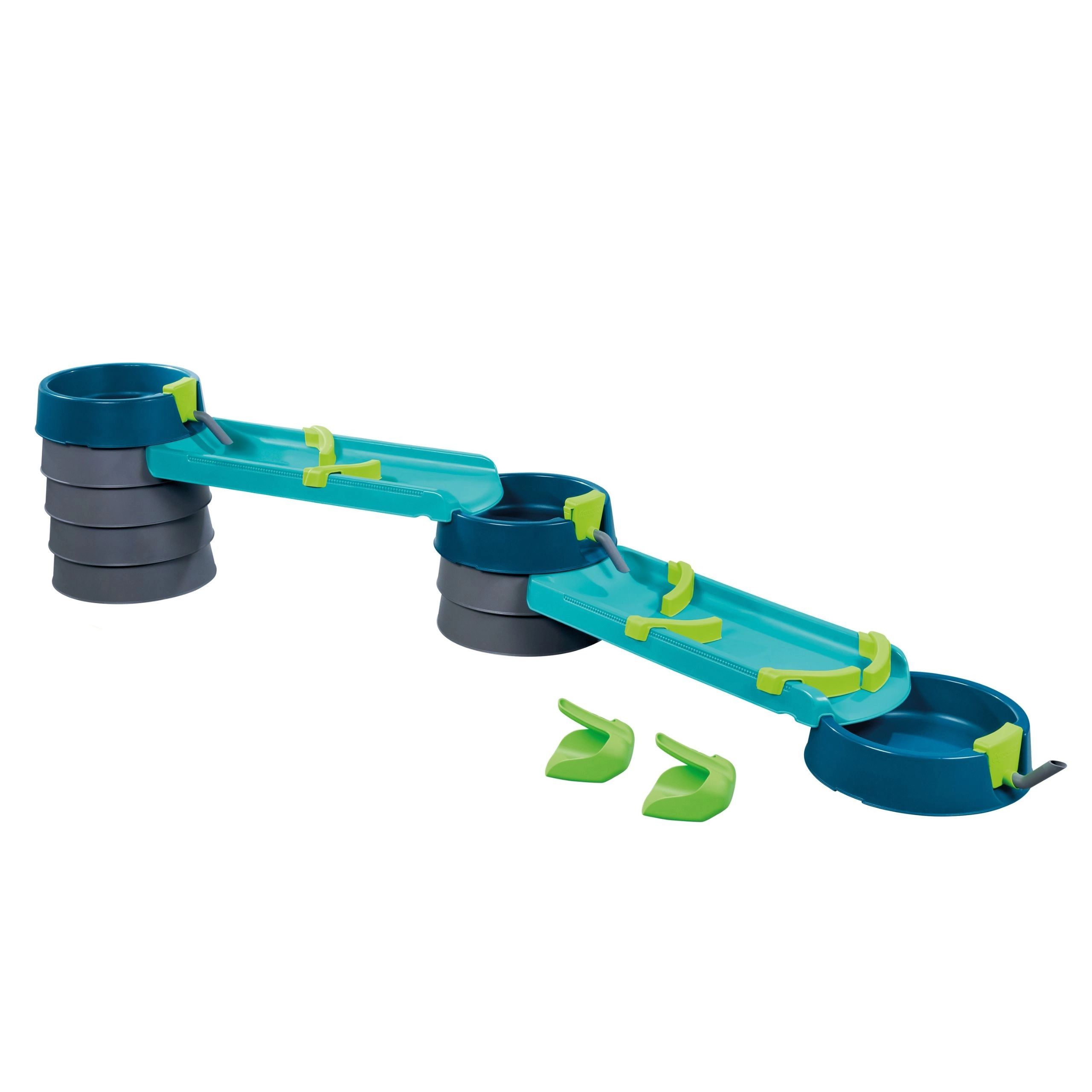 Premeňte záhradu na malé vodné laboratórium. Deti experimentujú s prúdením, skúšajú rôzne konfigurácie kanálov a sledujú, ako sa voda rozdeľuje a spája. Otočné tácky 360° a nastaviteľné zábrany umožňujú presne riadiť tok vody a budovať stále nové trasy.
