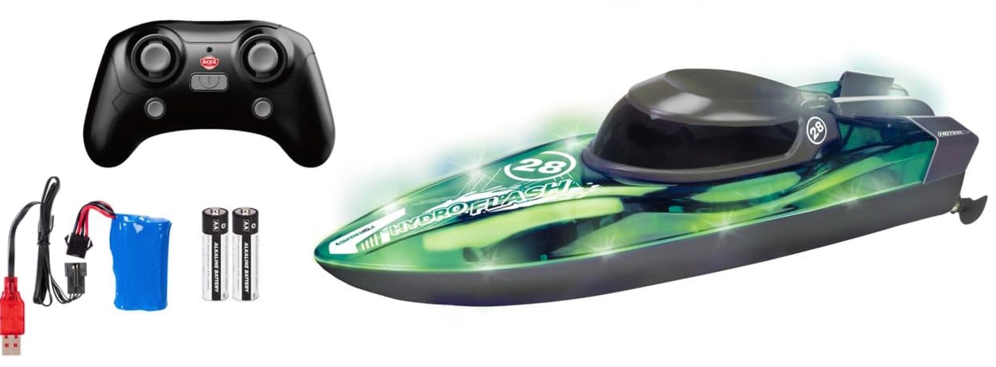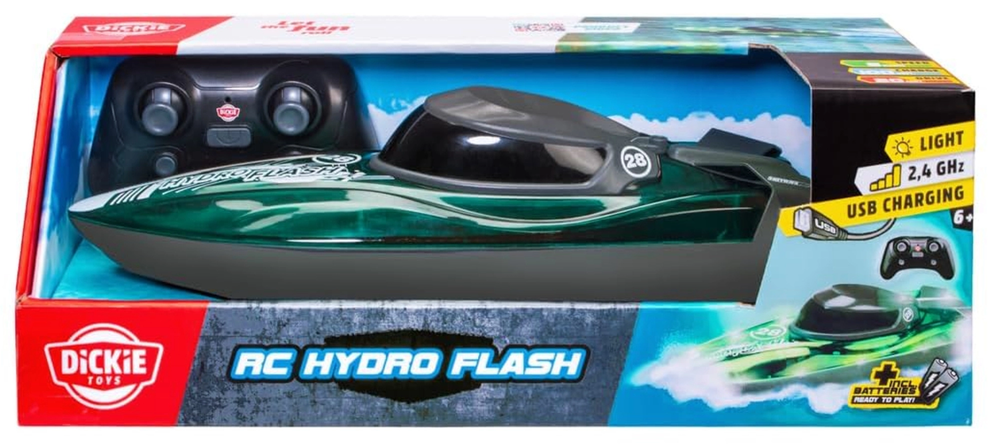 Zážitok z rýchlej jazdy na vode pre deti od 6 rokov! RC loď DICKIE TOYS Hydro Flash s dĺžkou 29 cm ponúka stabilné ovládanie 2,4 GHz, Turbo režim až 8 km/h a efektné podsvietenie podvozku. Po nabití vydrží jazdiť až 20 minút a je ideálna na zábavu vonku aj doma (vhodná do vane či bazéna).