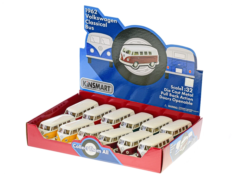 Tento autentický model s dĺžkou 13 cm zachytáva ikonické línie a dvojfarebné lakovanie klasického mikrobusu z roku 1962. Vďaka pevnej kovovej karosérii, priehľadným oknám a precíznym detailom, ako je znak VW a chrómované prvky, pôsobí model realisticky vo vitríne aj pri hre.
