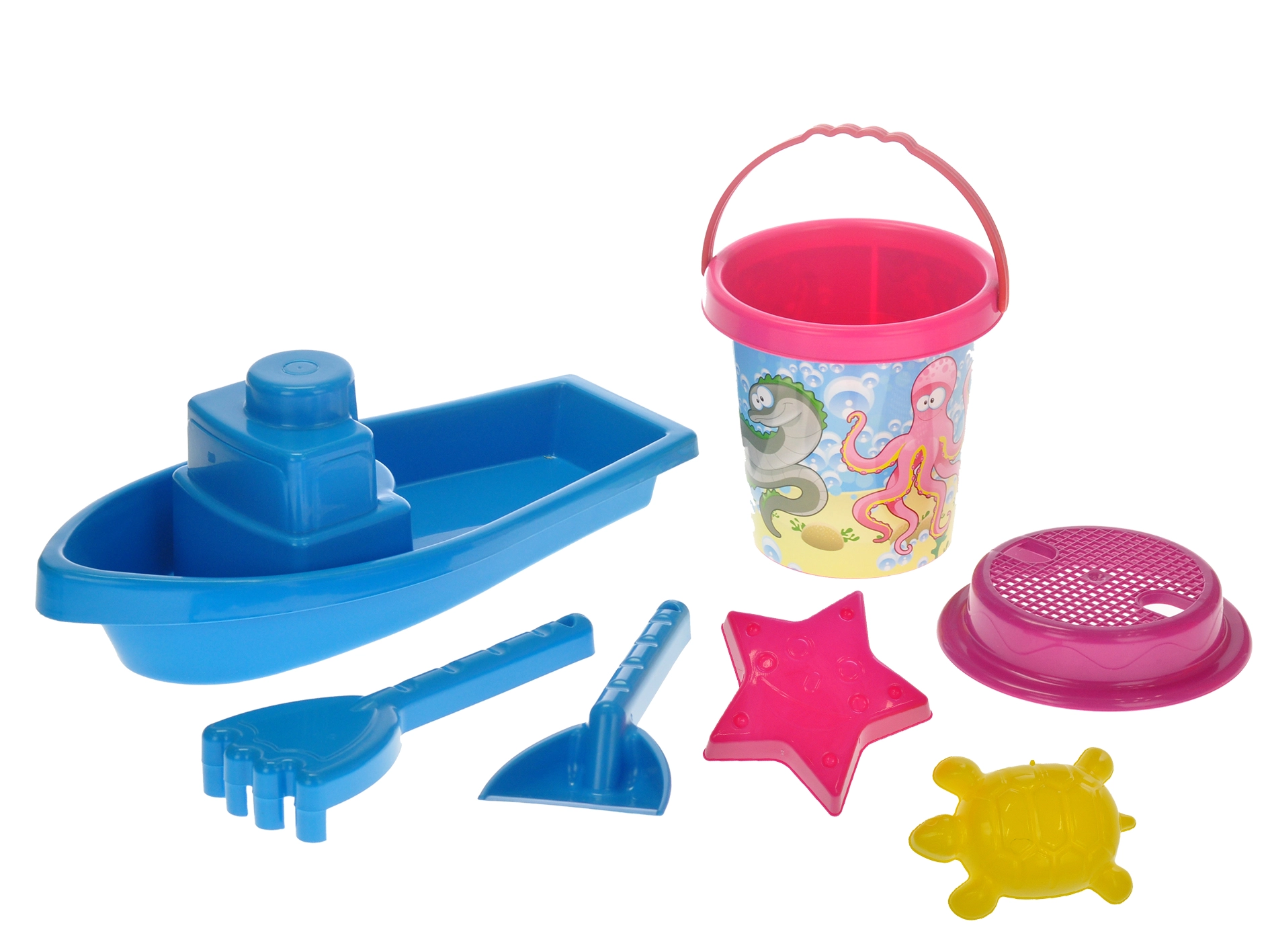 Zábavná 7-dielna súprava do piesku s loďkou pre malých prieskumníkov pieskovísk aj vody. Obsahuje vedierko, lopatku, hrable, sitko, formičku a loďku v pestrých farbách, ktoré deti okamžite zaujmú. Vyrobené z kvalitného, zdravotne nezávadného plastu odolného voči poškodeniu. Vhodné od 10 mesiacov na podporu jemnej motoriky a kreativity. Praktické balenie v sieťke na jednoduché prenášanie a skladovanie.