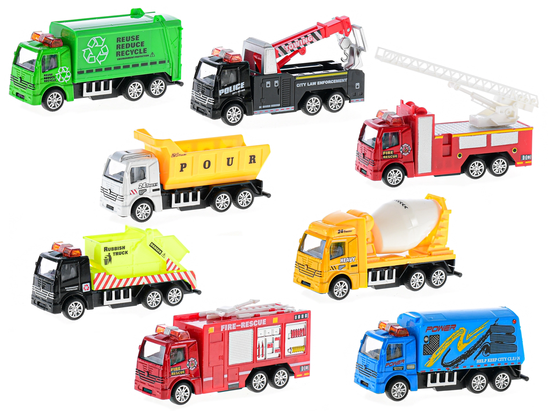 Každé prevedenie ponúka charakteristické detaily – od sklápačky a miešačky až po smetiarske vozidlo, odťahový voz POLICE či hasičské auto so rebríkom. Autíčka rozvíjajú jemnú motoriku, predstavivosť a prinášajú realistické herné scenáre mestnej premávky.