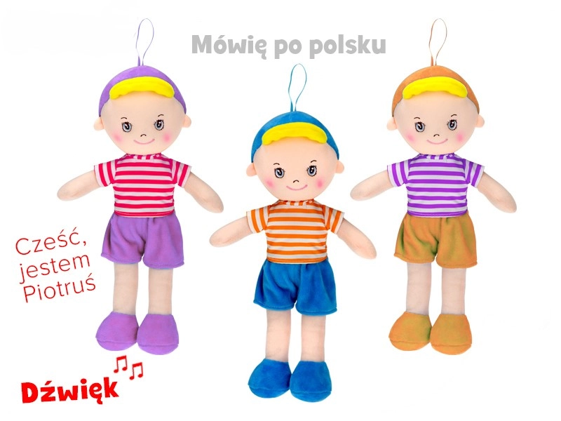 Roztomilý kamarát pre najmenších – mäkká látková bábika Piotruś s výškou 32 cm prináša pocit bezpečia, maznavé objatie a tiež interaktívnu zábavu. Vďaka funkciám hovorenia a spevu v poľštine podporuje jazykové zručnosti a sluchové vnímanie. K dispozícii v troch veselých farbách a s praktickým pútkom na zavesenie. Vhodná pre deti už od narodenia.