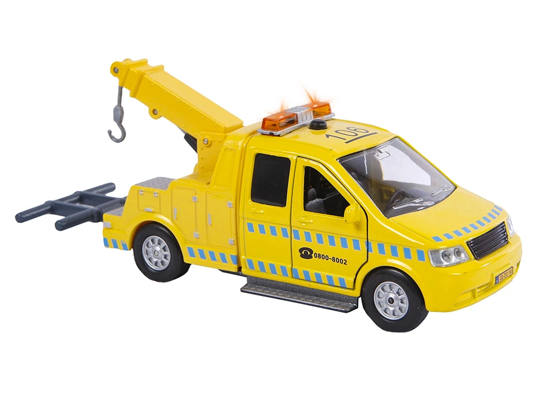 Realistické odťahové vozidlo Kids Globe Traffic s dĺžkou 16 cm kombinuje kovové a plastové diely pre vyššiu odolnosť a detailné spracovanie. Vďaka spätnému chodu sa po natiahnutí rozbehne vpred, otváracie dvere odhalia interiér a svetelné a zvukové efekty na tlačidlo pridajú na autenticite. Batérie LR41 sú súčasťou balenia, hračka je tak pripravená na okamžité použitie.