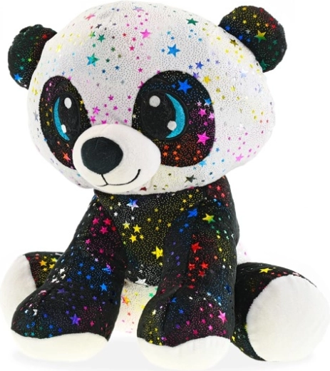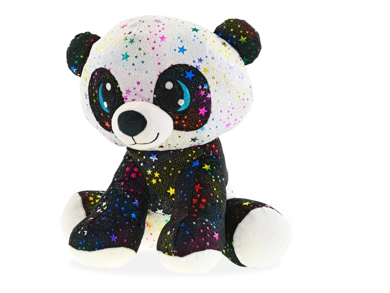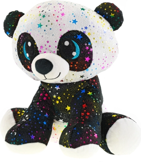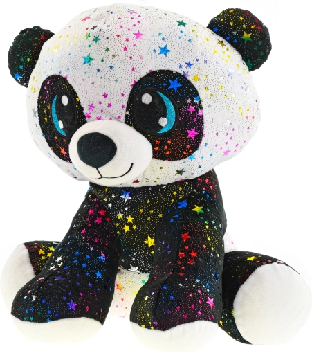 Táto plyšová panda v sediacej pozícii je navrhnutá pre maximálne pohodlie a radosť z hrania. Povrch zdobia multikolorové hviezdičky s trblietkom, ktoré z nej robia neprehliadnuteľného parťáka do postieľky aj na cesty. Mäkké výplne a príjemný materiál zaručujú, že sa k nej deti budú rady vracať.