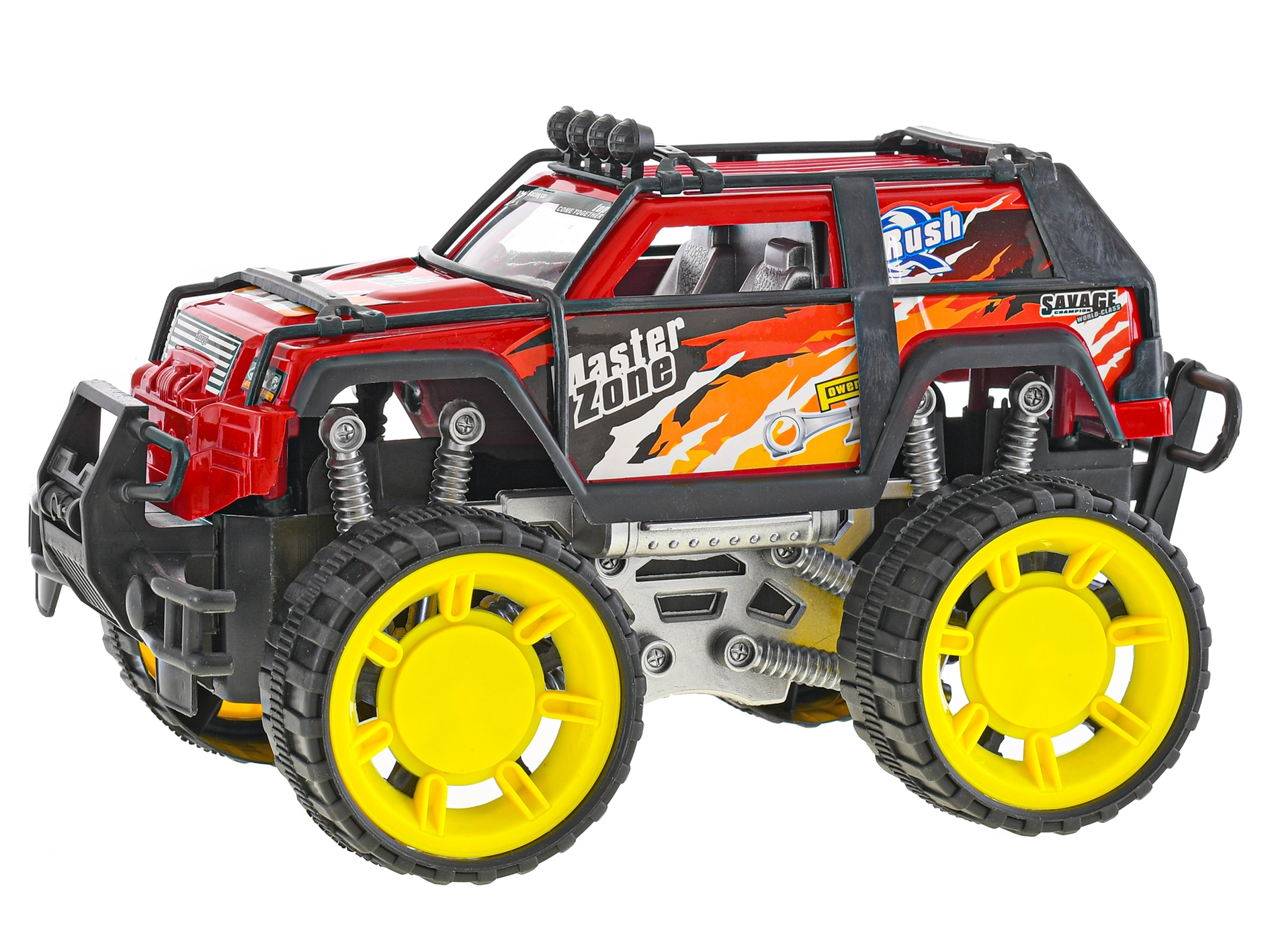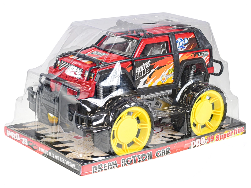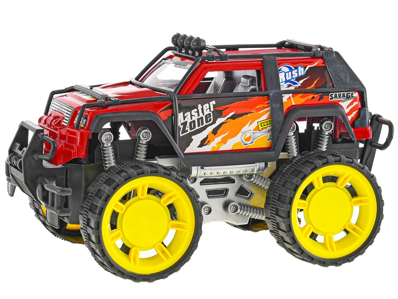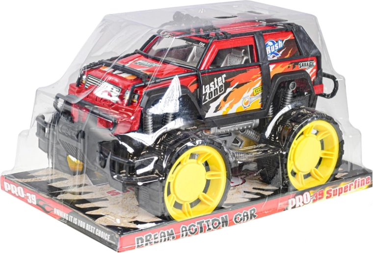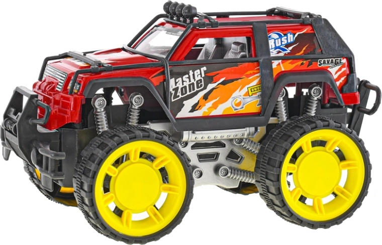 Tento červený off-road s masívnymi žltými kolesami a ochrannými rámami je stvorený pre akčnú jazdu. Pohon na zotrvačník zaistí hladký pohyb bez nutnosti batérií – stačí postrčiť a vyraziť. Odolné materiály a premyslené detaily, ako sú „tlmiče“ a nárazníky, poskytujú dlhú životnosť a bezpečnú hru.