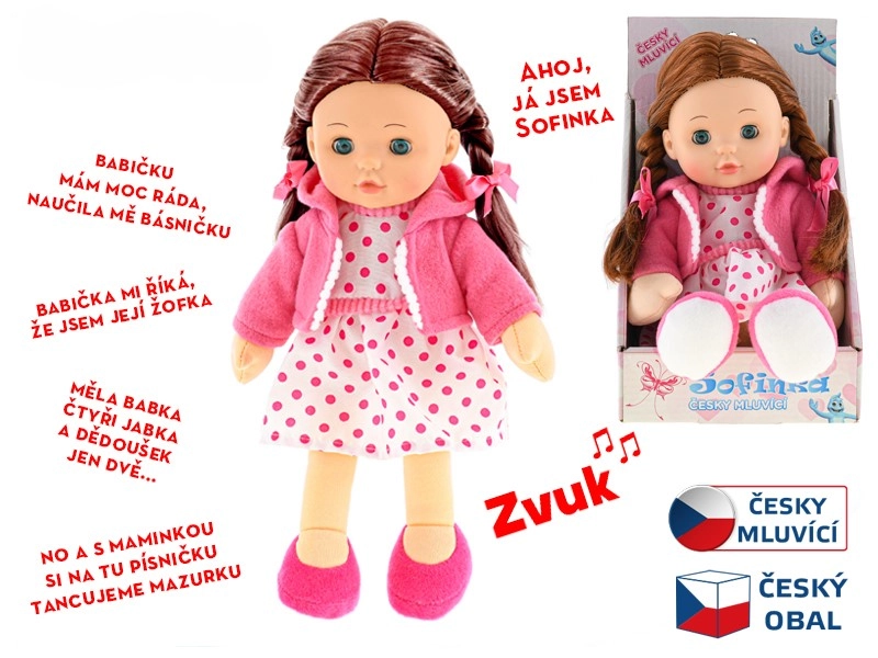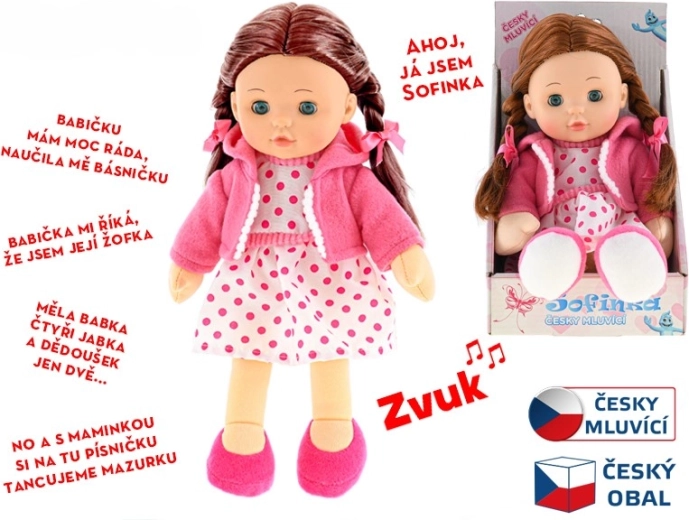 Bábika Sofinka je ideálnou spoločníčkou pre deti od 3 rokov. Jej mäkké telíčko je príjemné na dotyk a láka k mojkaniu, zatiaľ čo realistický vzhľad s hnedými vláskami a mrkacími očami podnecuje detskú predstavivosť. Sofinka navyše rozpráva po slovensky, čo zábavnou formou rozvíja komunikáciu a empatiu.
