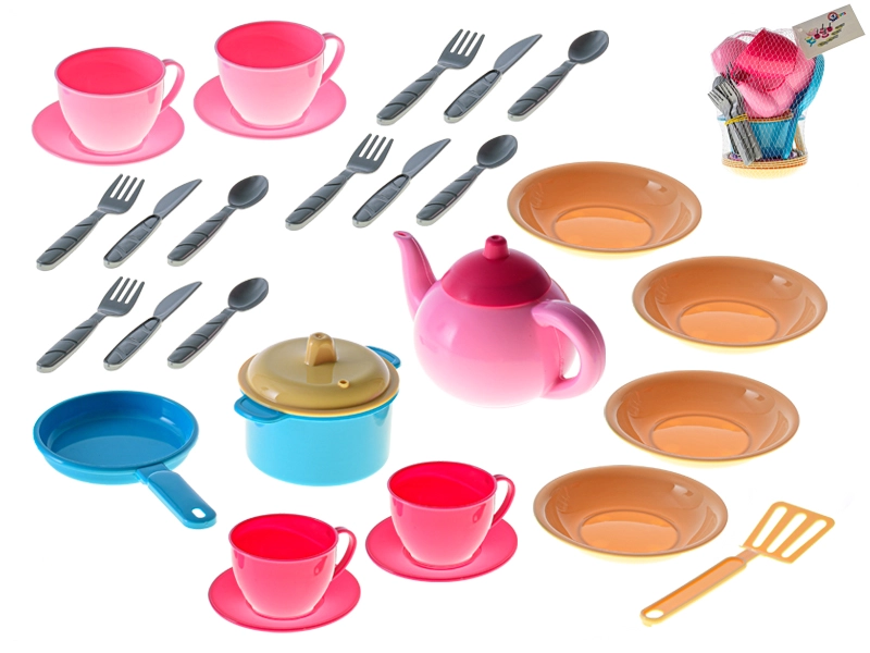 Doprajte deťom vlastnú kuchynku so všetkým, čo k tomu patrí. Detská sada riadu v praktickej sieťke prináša kompletnú výbavu na hru na varenie – od prípravy pokrmov až po čajové posedenie. Diely sú ľahké, bezpečné a farebne atraktívne, takže si ich deti rýchlo obľúbia.
