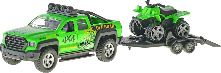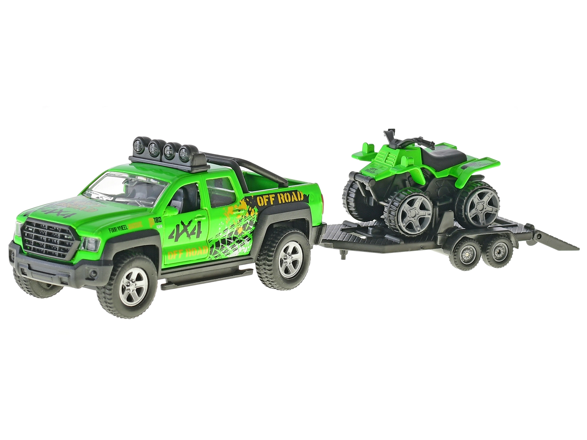 Detailný 4×4 pick-up s prívesom a štvorkolkou ponúka autentický herný zážitok – robustné kolesá, strešné svetlá a nájazdová rampa podporujú kreatívne scenáre.