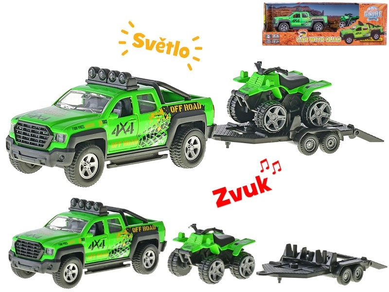 Tento detailne spracovaný model terénneho auta s prívesom a štvorkolkou prináša deťom autentický zážitok z jazdy. Kovové telo vozidla zabezpečuje dlhú životnosť a odolnosť, zatiaľ čo ťah na zotrvačník umožňuje prirodzený a zábavný pohyb. Svetelné a zvukové efekty dodávajú hre skutočnú atmosféru.
