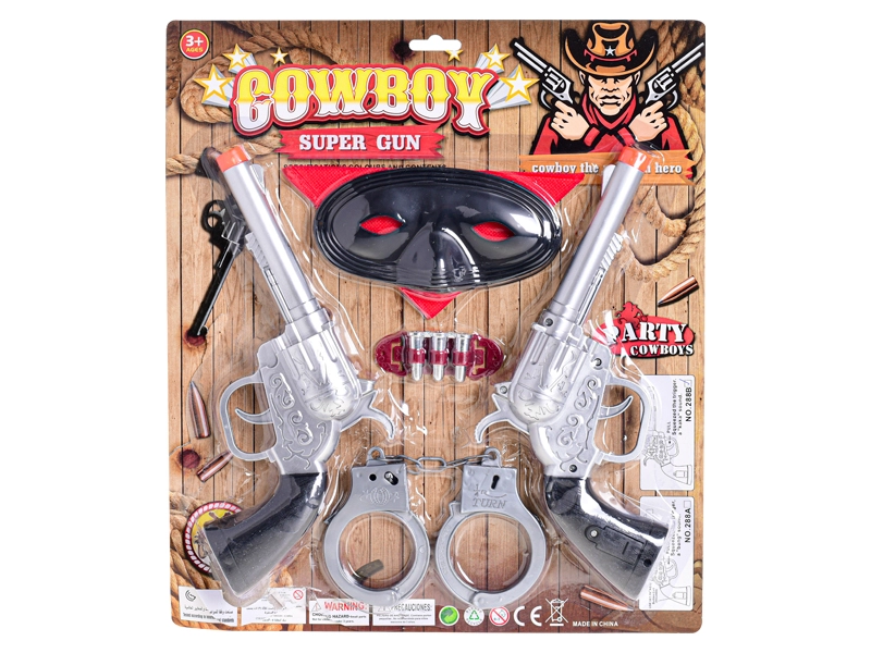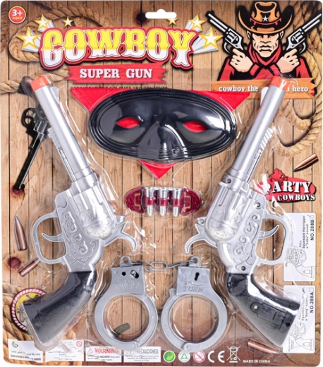 2× kovbojská pištoľ, 1× putá, 1× maska