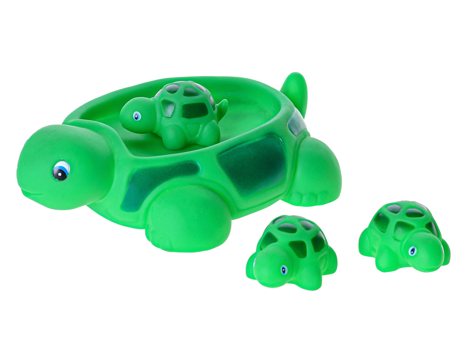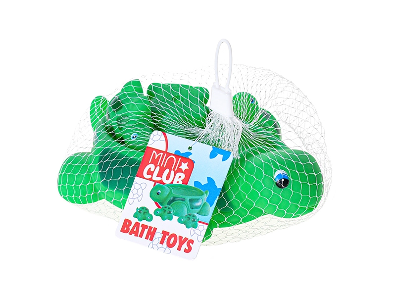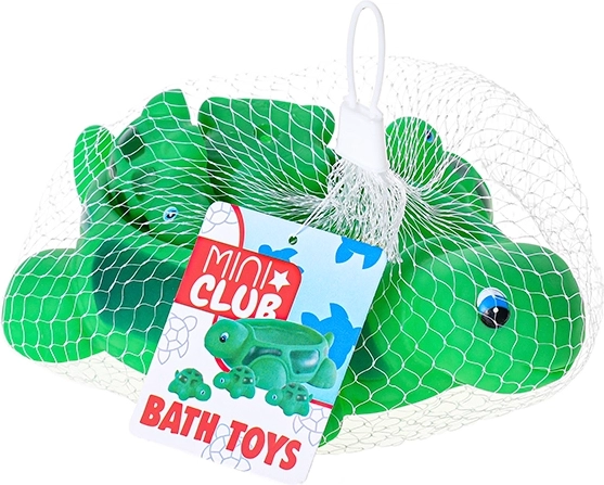 Táto rozkošná sada kúpacích hračiek prináša deťom veľa radosti pri každom kúpaní. Veľká zelená korytnačka poslúži ako loďka alebo mištička a jej tri malé korytnačiatka možno posadiť na pancier, nechať voľne plávať alebo stláčať pre rozvoj jemnej motoriky. Mäkký, príjemný plast je šetrný k detským dlaniam a hladké tvary s roztomilými očkami podporujú interaktívnu hru vo vode.