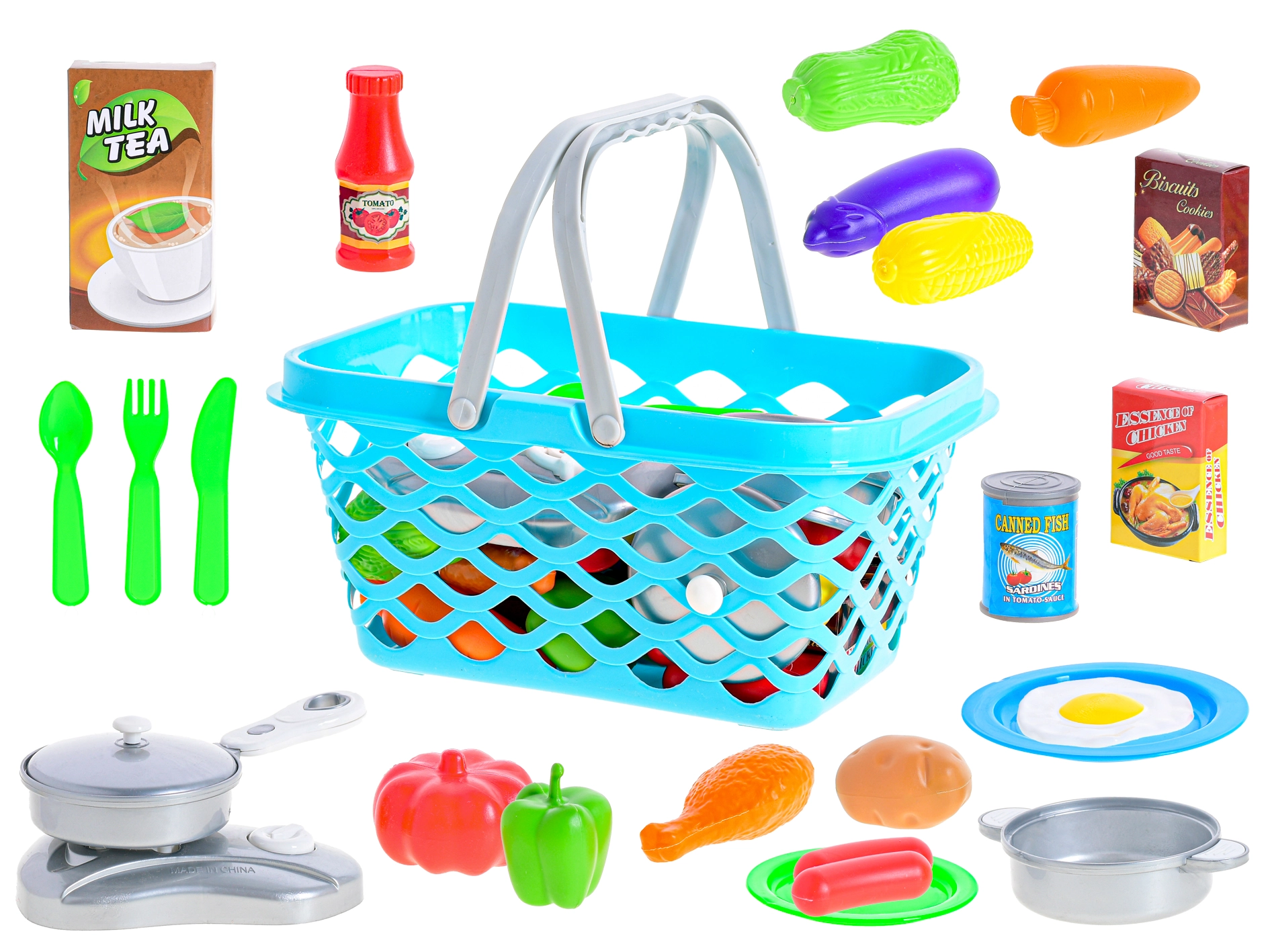 - Košík, varič, hrniec, panvica, príbory, taniere, makety potravín
