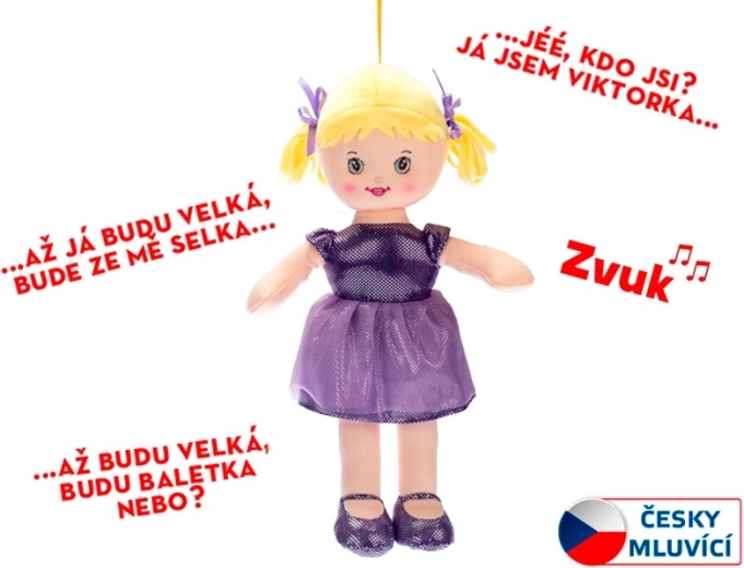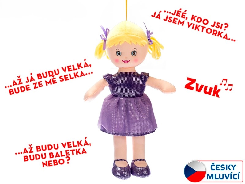 Bábika Viktorka je hebká látková kamarátka, ktorá deti sprevádza prvými krôčikmi vo svete hier. Zaujme svojimi fialovými šatočkami a topánočkami a navyše po stlačení hovorí a spieva po slovensky: „Keď budem veľká, zo mňa bude sedliačka…“. Skvelá voľba pre rozvoj zmyslov, jemnej motoriky a citového vnímania.