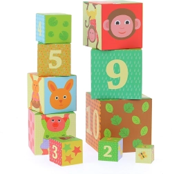 Objavte hravú sadu 10 kartónových kociek s krásnymi ilustráciami zvierat, ktoré deti učia počítať, rozpoznávať farby a zvieratká. Pri stavaní veží rozvíjajú jemnú motoriku a koordinačné schopnosti. Ekologicky vyrobené a ľahké kocky sú ideálne na ľahké skladanie aj vkladanie do seba.