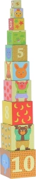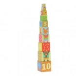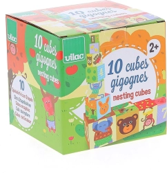 Táto farebná skladacia veža od značky VILAC obsahuje 10 pevných kartónových kociek s očíslovanými stranami a ilustráciami zvierat. Deti môžu kocky stavať do vysokej veže alebo ich vkladať jednu do druhej, čím prirodzene trénujú počty, rozlišovanie veľkostí a rovnováhu.
