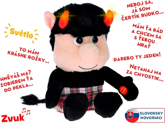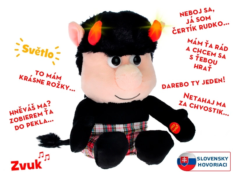 Plyšový čertík Rudko je veselý spoločník na každodenné hranie. Vďaka príjemnému plyšovému materiálu je ideálny na pritúlenie, zatiaľ čo jeho zábavné slovenské hlášky a blikajúce rohy rozosmejú deti aj dospelých. Stačí stlačiť ruku a zábava môže začať.