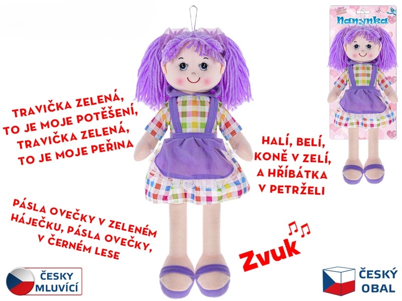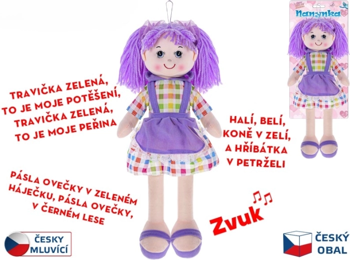 Roztomilá bábika Nanynka s mäkkým telíčkom poteší každú malú princeznú. Má výšku 50 cm, je oblečená do fialových šatočiek a vďaka funkciám hovorí a spieva v češtine. Jej mäkké prevedenie zabezpečuje bezpečné a pohodlné hranie už od narodenia. Súčasťou je napájanie na 3× gombíkovú batériu LR44.