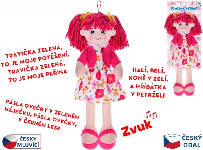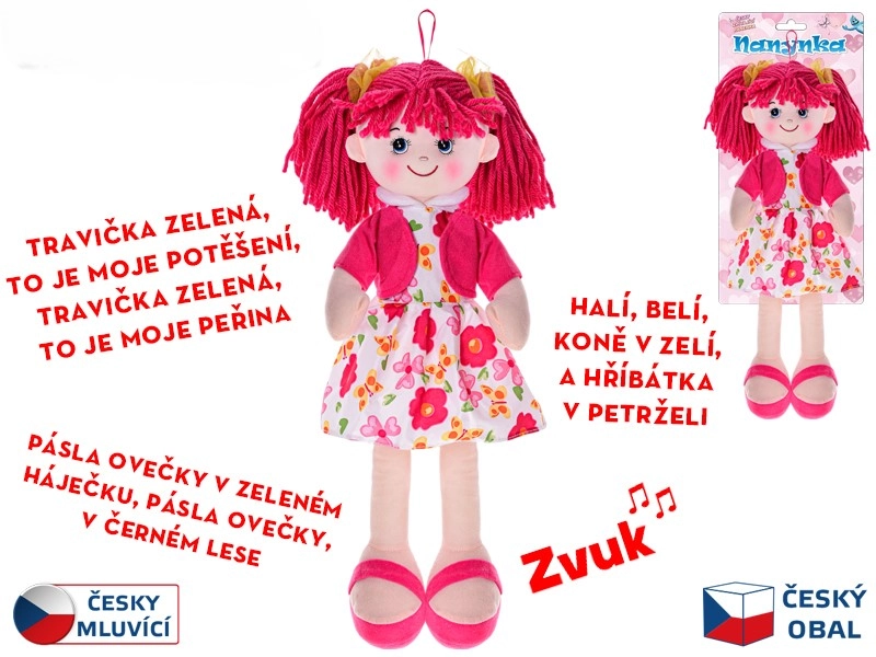 Látková bábika Nanynka očarí deti svojím jemným vzhľadom a hebkým telom. Vďaka výške 50 cm sa ľahko drží, mojká a sprevádza deti pri hre aj zaspávaní. Po stlačení bruška Nanynka spieva obľúbené české pesničky (napr. „Halí, belí…“, „Travička zelená…“, „Pásla ovečky…“) a recituje, čím podporuje rozvoj sluchového vnímania, rytmu a rečových zručností.